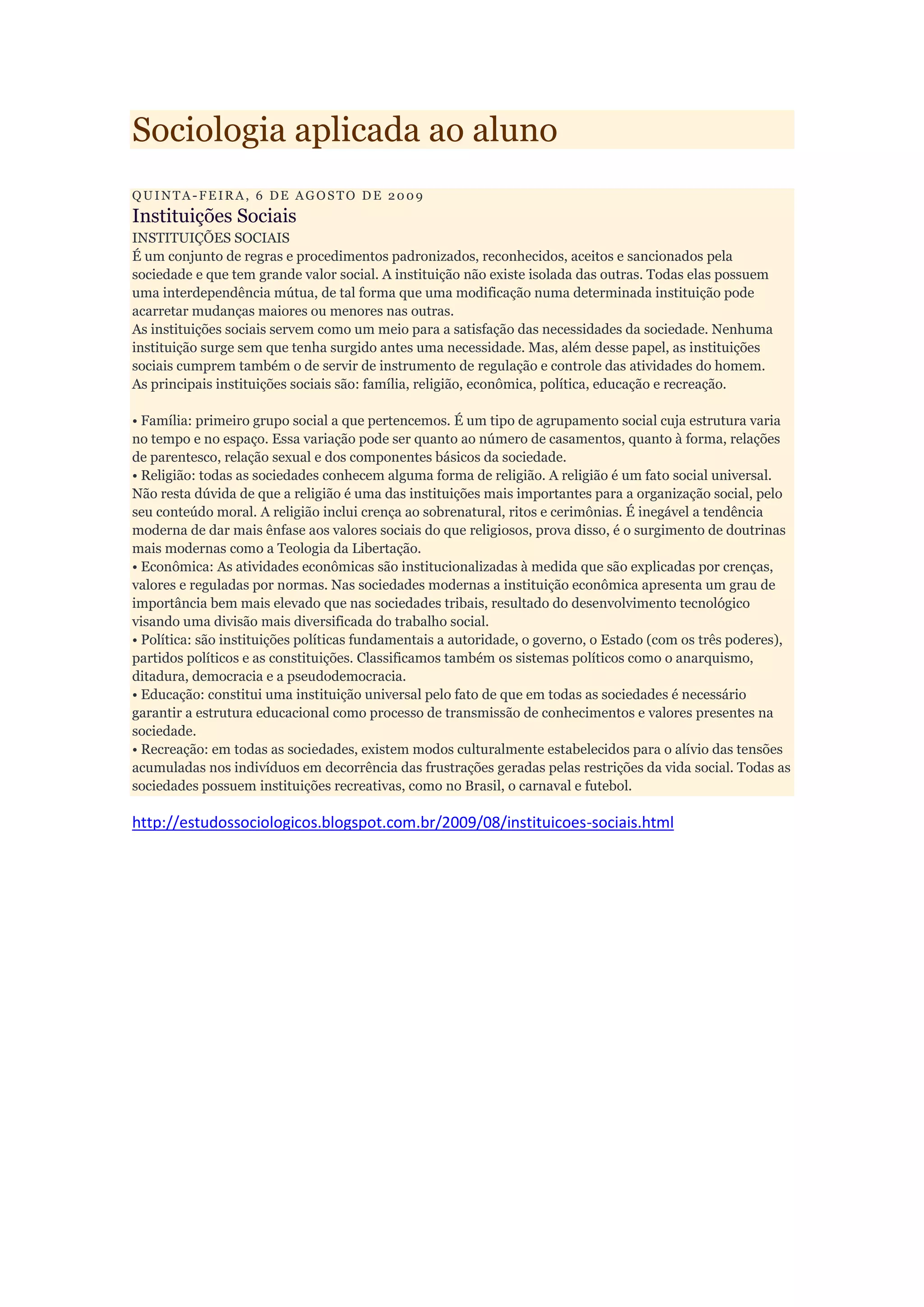 O documento descreve as principais instituições sociais, incluindo família, religião, economia, política, educação e recreação. Explica que as instituições sociais estabelecem regras e procedimentos para satisfazer as necessidades da sociedade e regular as atividades humanas. Além disso, destaca que as instituições sociais são interdependentes e uma mudança em uma pode afetar as outras.