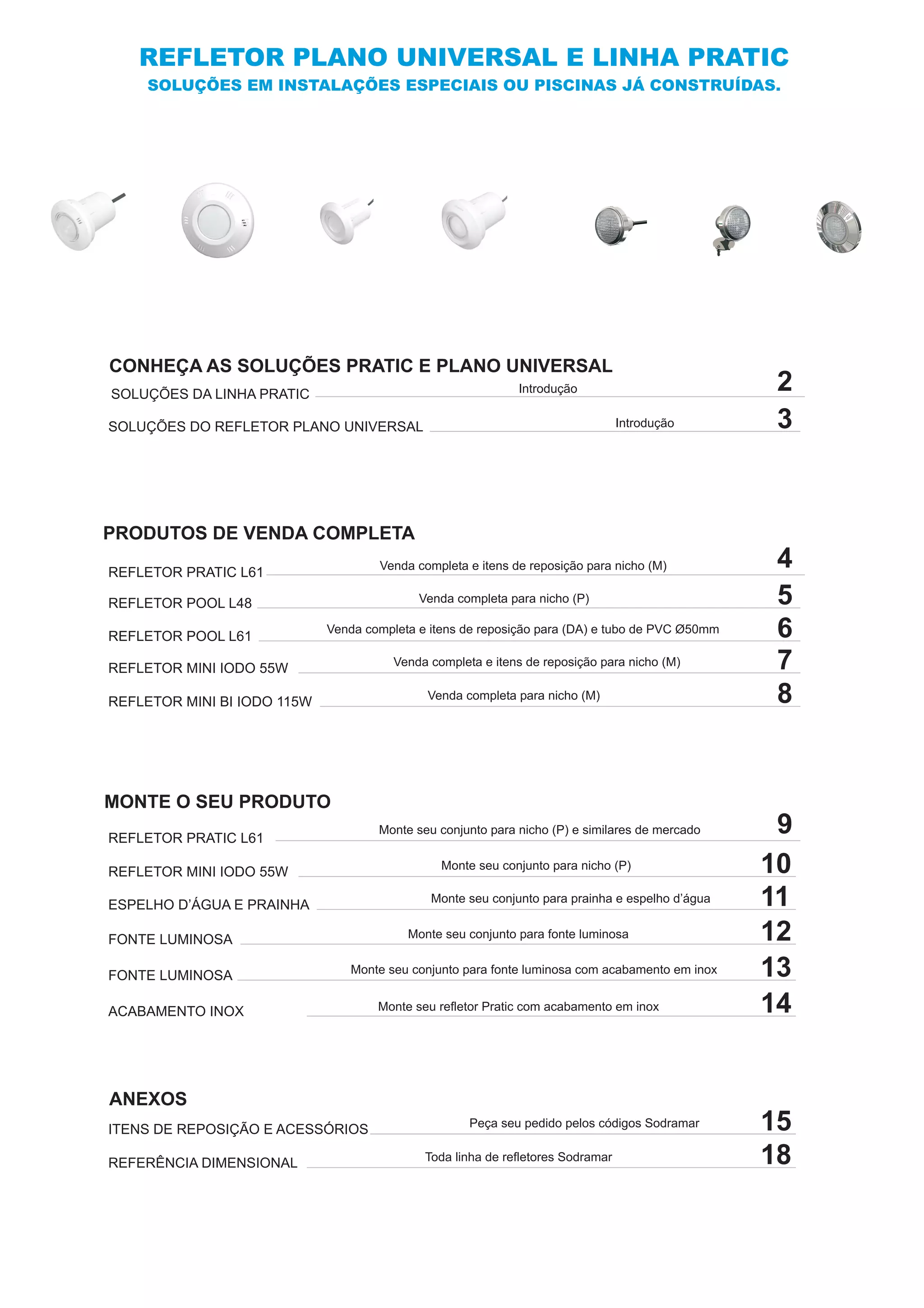 O documento fornece instruções e opções de produtos para a instalação de iluminação em piscinas utilizando as linhas Pratic e Plano Universal da Sodramar, apresentando soluções para diferentes tipos de instalações e orientações para compra e montagem dos conjuntos.