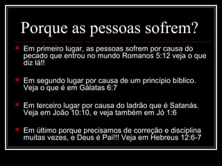 O documento discute as causas do sofrimento humano, incluindo o pecado, as consequências das ações e a interferência de Satanás, e apresenta quatro atitudes para lidar com problemas e sofrimentos: alegria, fé, paciência e sabedoria. A sabedoria é definida como a forma correta de alcançar um objetivo, ilustrada pelo exemplo de Neemias.