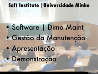Apresentação/Demonstração na Universidade do Minho A empresa Soft Institute - Informática e Serviços, Lda., fez em 19 de Junho de 2015, uma apresentação/demonstração do Software de apoio à Gestão da Manutenção – DimoMaint – aos alunos de Mestrado em Engenharia e Gestão Industrial do departamento de Produção e Sistemas (DPS). Tendo como principal objetivo a formação de Engenheiros aptos a tratar os problemas de otimização e racionalização de recursos da indústria. O DPS é um departamento bipolar da Escola de Engenharia da Universidade do Minho, com instalações no Campus de Azurém (Guimarães) e no Campus de Gualtar (Braga).