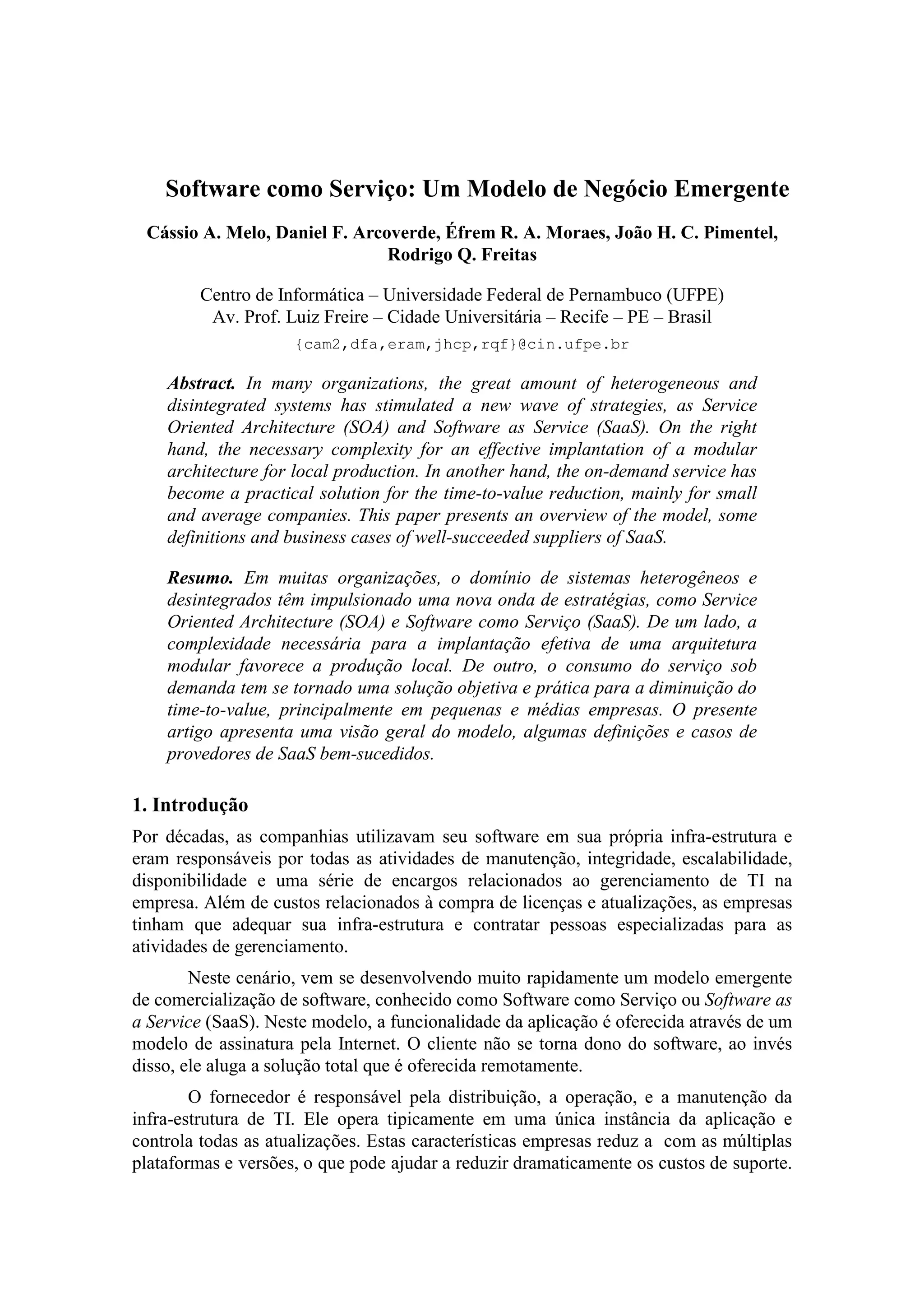 1. O documento discute o modelo emergente de Software como Serviço (SaaS), onde as empresas oferecem software como um serviço acessado via internet, ao invés de licenciamento de software.