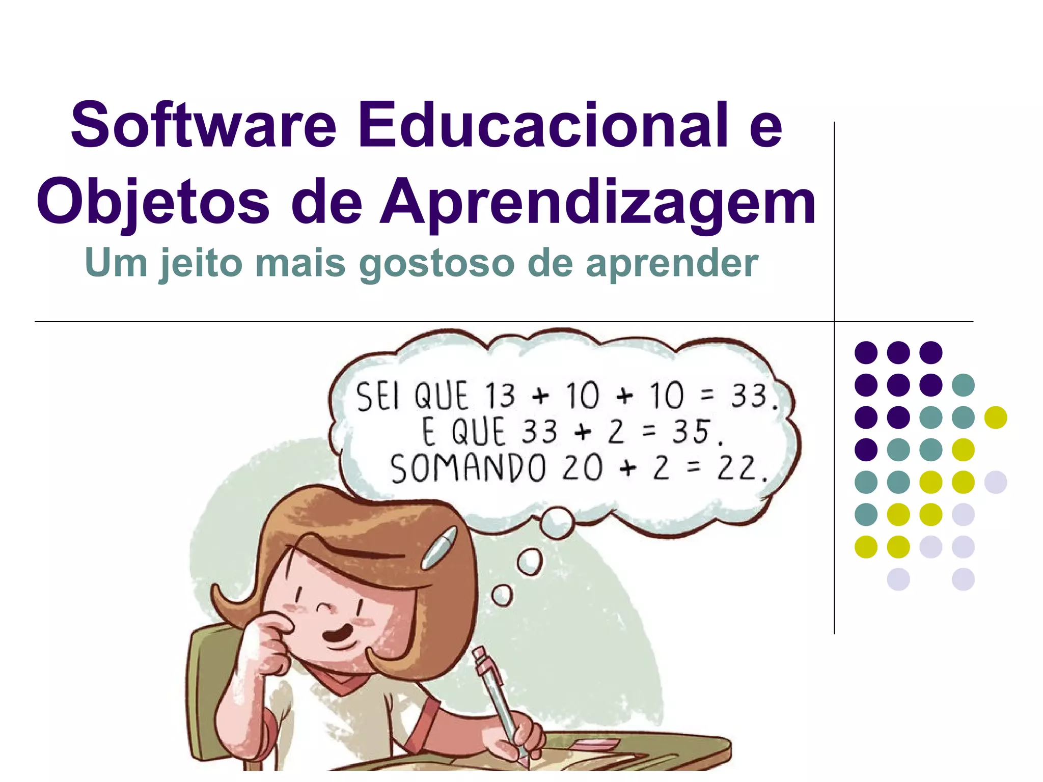 O documento discute o uso de objetos de aprendizagem e software educacional para ensinar de forma interativa e atraente. O RIVED produz conteúdos digitais como animações e simulações para apoiar diferentes métodos de aprendizagem como tutoriais, exercícios, jogos e simulações. As novas tecnologias podem mudar a forma como as pessoas aprendem de forma mais rápida e significativa.