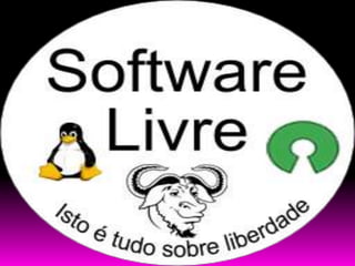 O documento discute o que é software livre, definindo-o como programas de computador que podem ser usados, copiados, modificados e redistribuídos sem restrições. Ele também descreve as quatro liberdades associadas ao software livre: uso, aprendizado, redistribuição e publicação. Por fim, discute o sistema operacional Linux como um exemplo importante de software livre.