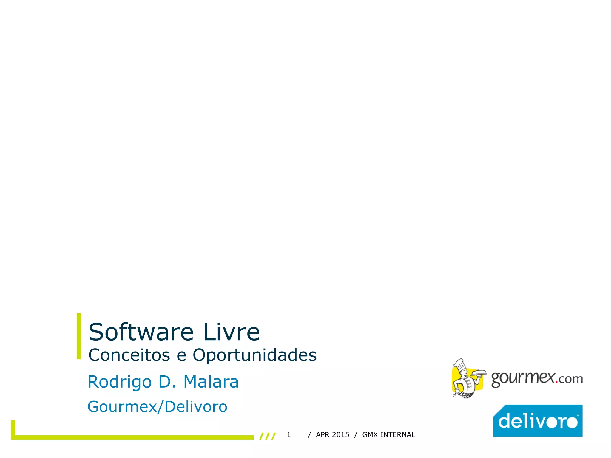O documento aborda os conceitos e oportunidades do software livre, destacando suas definições, características e a importância das licenças que permitem aos usuários a liberdade de uso, modificação e distribuição. Também menciona a história do software, as personalidades e organizações envolvidas, como a Free Software Foundation e a Open Source Initiative, além de apresentar oportunidades de negócios associadas ao software livre. Exemplos de grandes projetos de software livre, como Linux e FreeBSD, são destacados como parte do conteúdo.