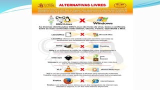 O documento explora o conceito de software, distingui entre software proprietário e livre, e descreve as liberdades associadas ao software livre promovidas pela Free Software Foundation. Destaca a importância do copyleft e as vantagens do uso de software livre em comparação ao software privativo, incluindo questões de privacidade e segurança. Também menciona a legislação relacionada à pirataria de software no Brasil e incentiva o uso de softwares legais e livres.
