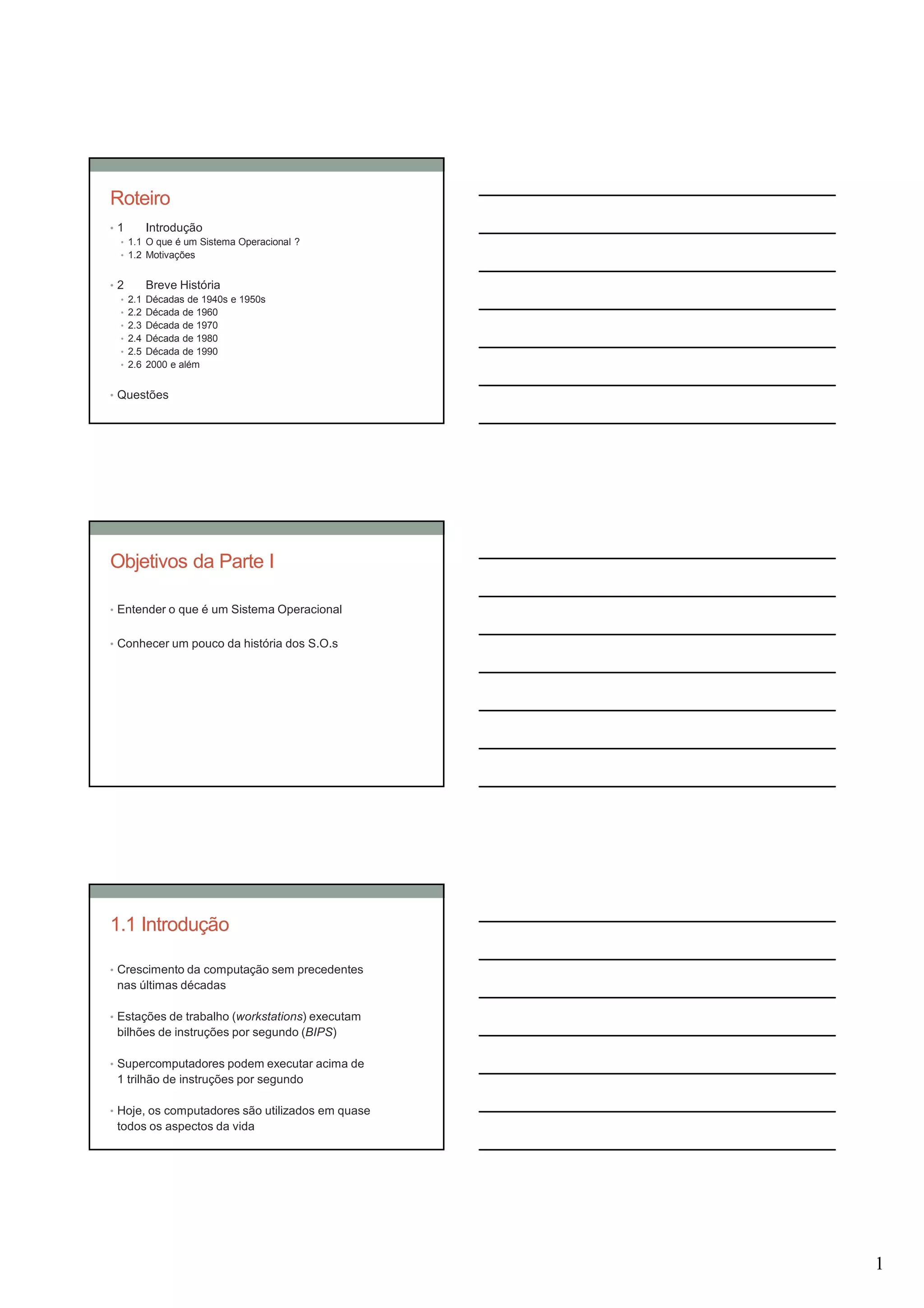 O documento descreve a história e conceitos básicos de sistemas operacionais, desde as décadas de 1940 e 1950, quando computadores eram controlados manualmente, até os dias atuais, com sistemas operacionais amigáveis e serviços na nuvem. Ele também discute as motivações para estudar sistemas operacionais e sua evolução ao longo do tempo, incluindo o desenvolvimento de interfaces gráficas e sistemas open source.