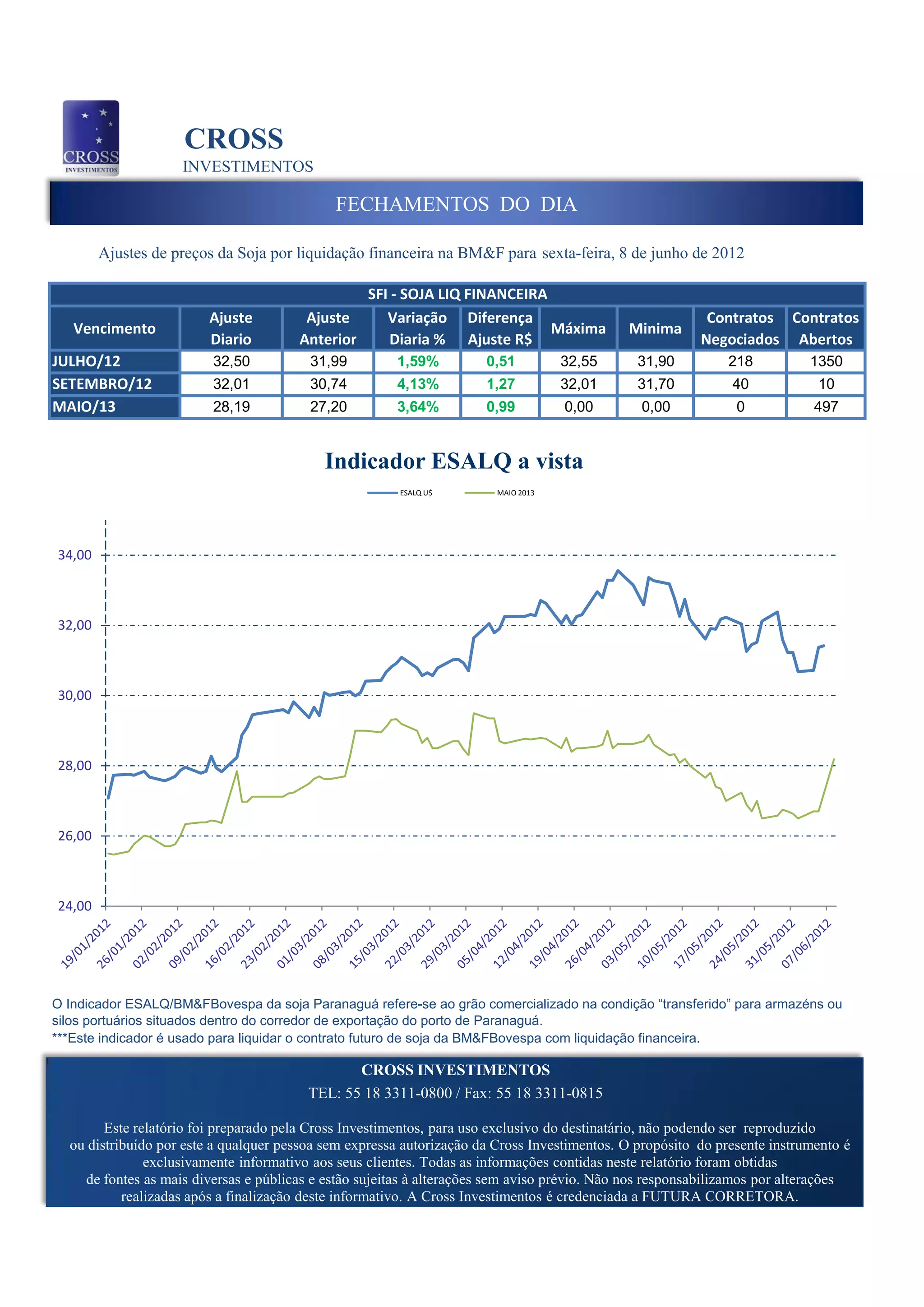 O documento apresenta os ajustes de preços da soja por liquidação financeira na BM&F para sexta-feira, 8 de junho de 2012, com destaque para os vencimentos de julho, setembro e maio de 2013. Além disso, mostra o indicador ESALQ da soja Paranaguá a vista e esclarece que este é usado para liquidar contratos futuros de soja com liquidação financeira.