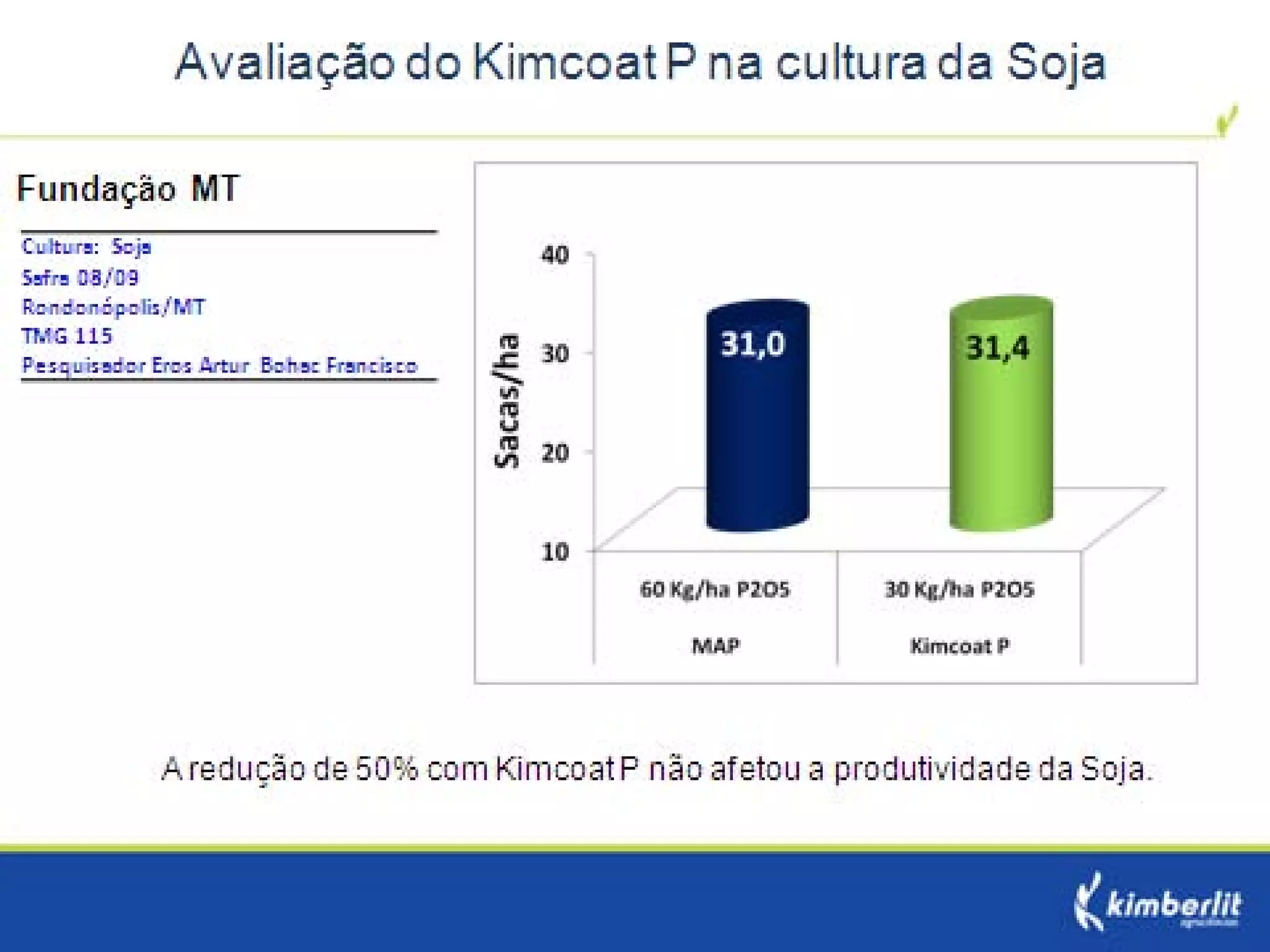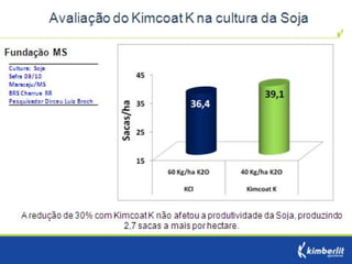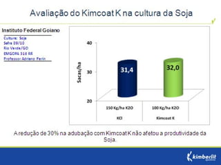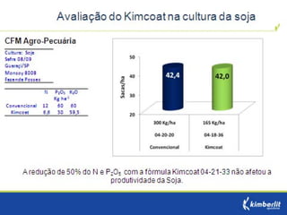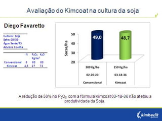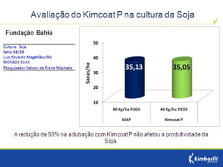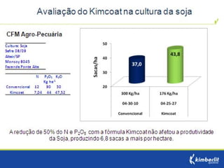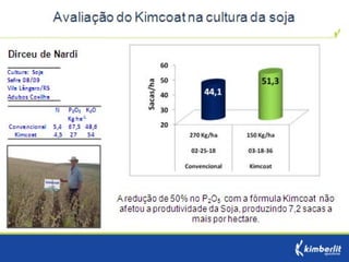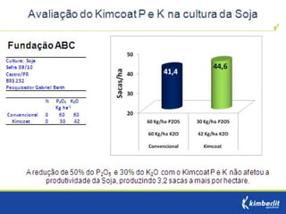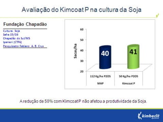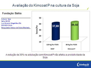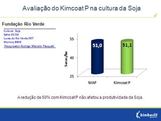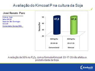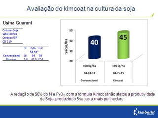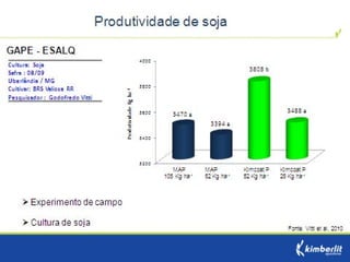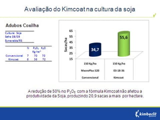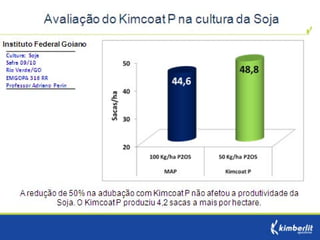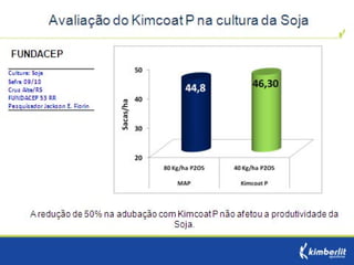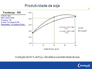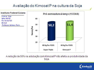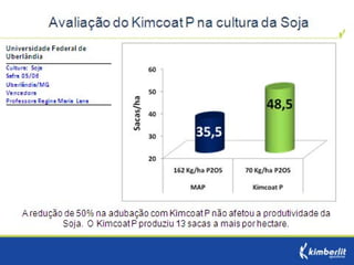 Este estudo avaliou diferentes programas nutricionais na produção de soja. Foram testados fertilizantes convencionais e revestidos, tratamento de sementes e adubação foliar. Os tratamentos que aplicaram fertilizante fósforo revestido, tratamento de sementes e adubação foliar apresentaram as maiores produtividades, chegando a 4.361 kg/ha. O fertilizante fósforo convencional teve menor produtividade, de 2.130 kg/ha.