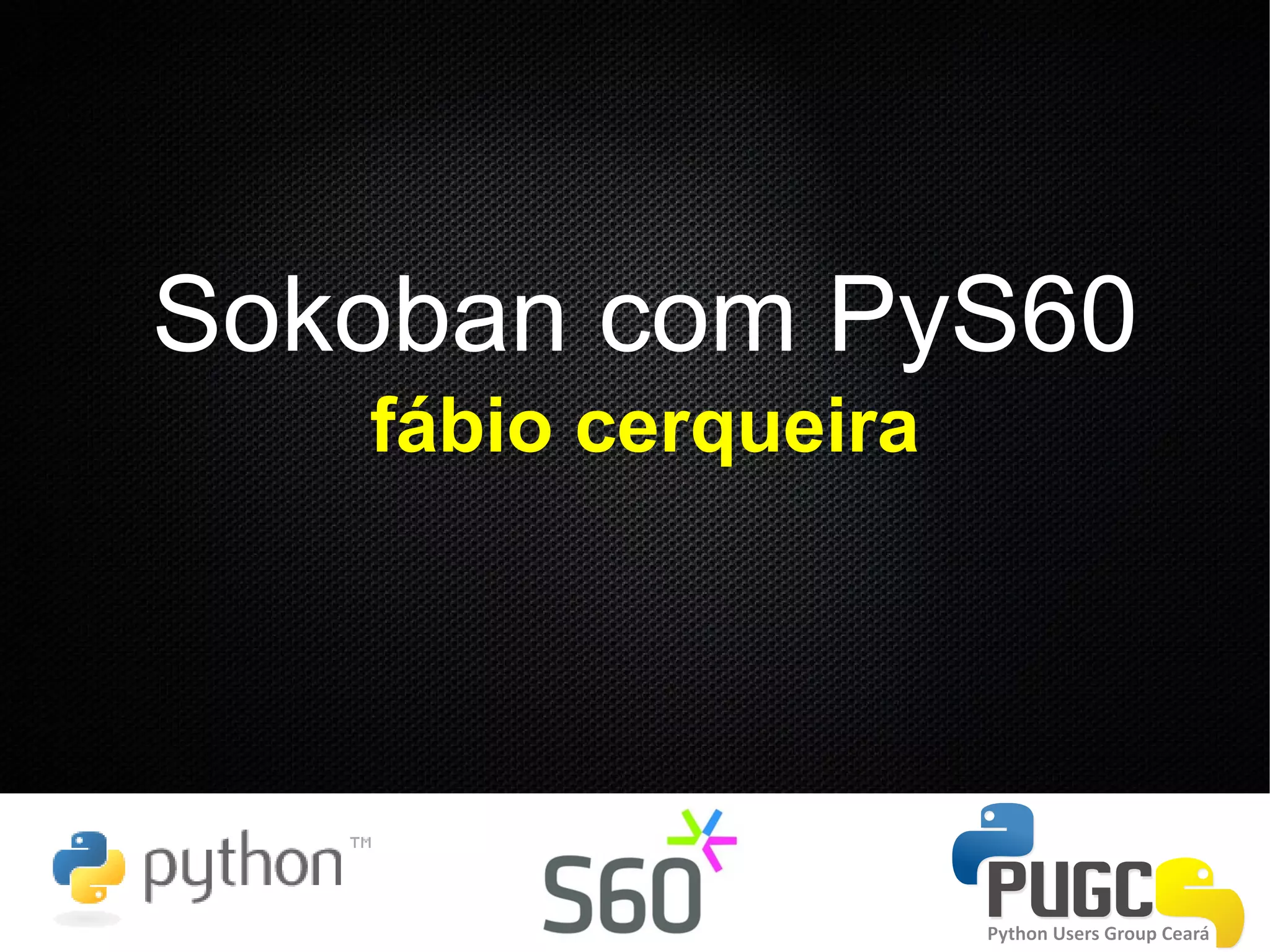 Este documento apresenta o framework PyS60 e como ele pode ser usado para desenvolver jogos para dispositivos móveis Symbian OS, como o Nokia S60. O documento discute como baixar e instalar o PyS60, criar uma aplicação "Hello World", usar módulos como appuifw e graphics, e como o autor desenvolveu um jogo Sokoban como exemplo.