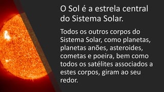 O Sol é a estrela central do Sistema Solar, responsável por quase toda sua massa. Sua luz demora aproximadamente 8 minutos para chegar à Terra e é essencial para a vida, fornecendo energia através da fotossíntese. Composto principalmente de hidrogênio e hélio, o Sol orbita no centro da Via Láctea e é a origem do Sistema Solar.