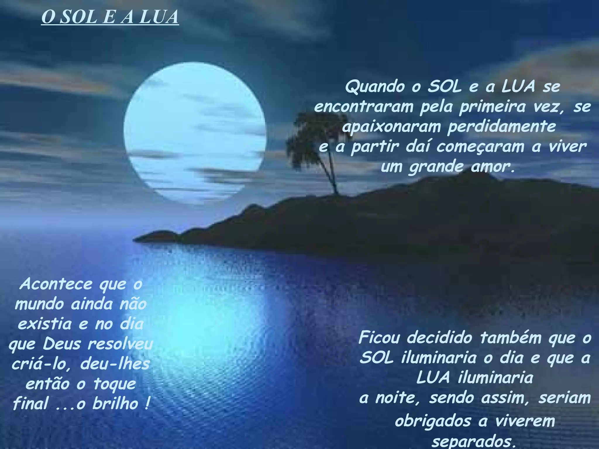 O SOL EA LUA Quando o SOL e a LUA se encontraram pela primeira vez, se apaixonaram perdidamente e a partir daí começaram a viver um grande amor. Acontece que o mundo ainda não existia e no dia que Deus resolveu criá-lo, deu-lhes então o toque final ...o brilho ! Ficou decidido também que o SOL iluminaria o dia e que a LUA iluminaria a noite, sendo assim, seriam obrigados a viverem separados.