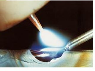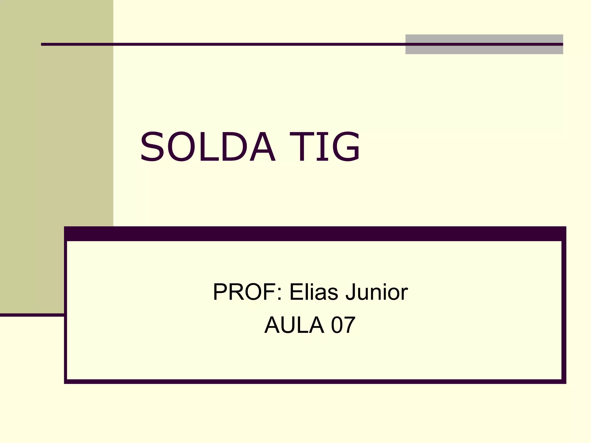 O documento descreve o processo de soldagem TIG (Tungsten Inert Gas), no qual um arco elétrico é criado entre um eletrodo de tungstênio não consumível e a peça a ser soldada, protegida por um fluxo de gás inerte. O TIG produz soldas de alta qualidade, especialmente em metais sensíveis à oxidação como titânio e alumínio. No entanto, possui baixa produtividade e custo mais elevado em comparação a outros métodos.