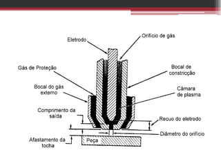 O documento fornece uma introdução à soldagem por plasma, descrevendo sua definição, vantagens, limitações, equipamentos, consumíveis e parâmetros do processo. É destacado que o processo produz junção dos metais pelo aquecimento com um arco constrito entre o eletrodo e a peça de trabalho ou entre o eletrodo e o bocal constrito da tocha, tendo menor zona termicamente afetada e capacidade de soldagem em baixa corrente.