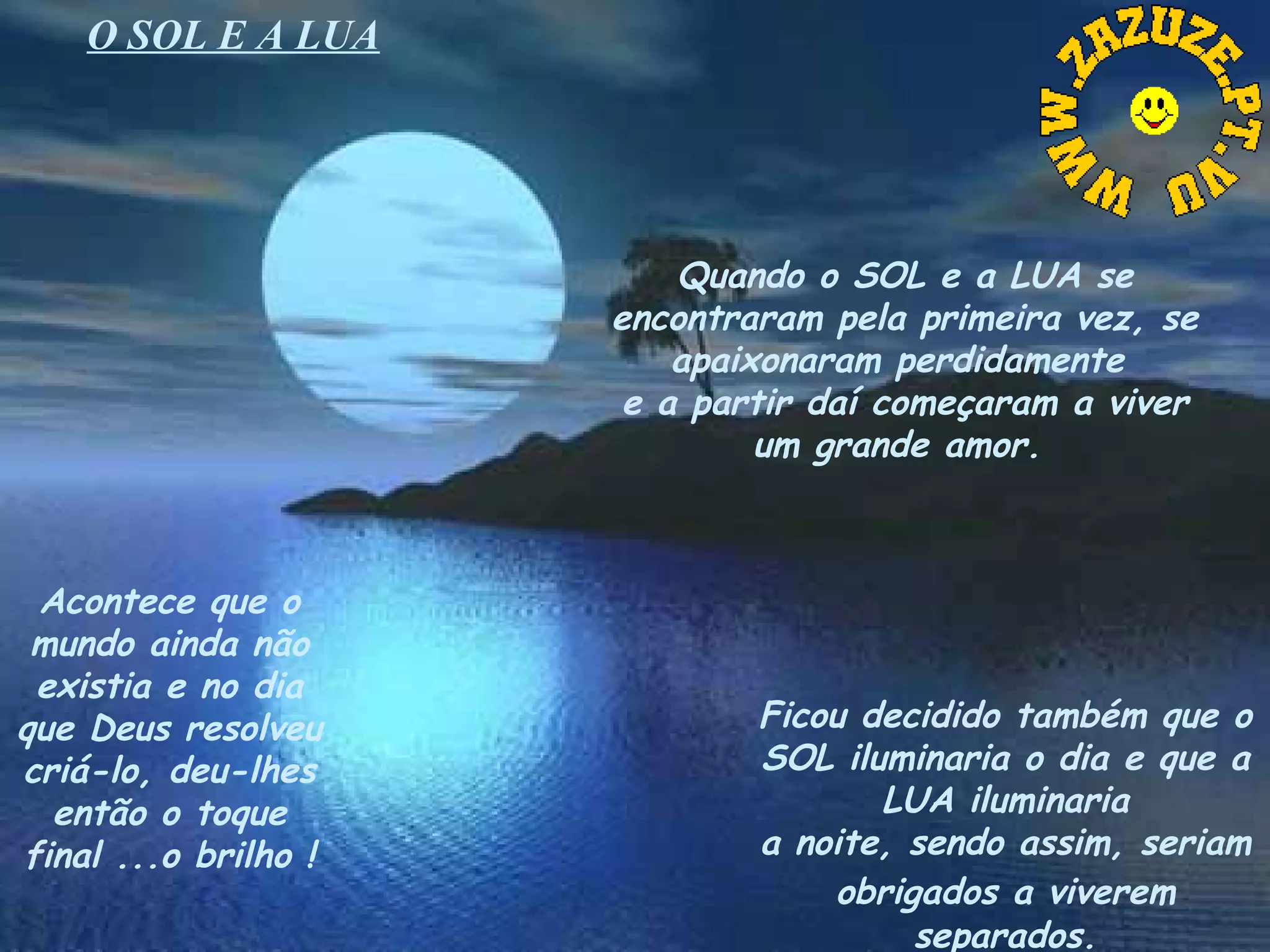 O Sol e a Lua se apaixonaram, mas foram separados por Deus para iluminarem o dia e a noite. A Lua ficou triste com a solidão, mas as estrelas foram criadas para fazê-la companhia. Durante os eclipses, Sol e Lua podem se reunir brevemente em um momento de amor.
