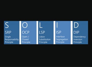 O documento discute os princípios SOLID para boas práticas de programação orientada a objetos. Apresenta os cinco princípios: Single Responsibility (classes devem ter uma única responsabilidade), Open-Closed (classes devem estar abertas para extensão mas fechadas para modificação), Liskov Substitution (classes base devem ser substituíveis por suas subclasses), Dependency Inversion (módulos de alto nível não devem depender de módulos de baixo nível) e Interface Segregation (interfaces específicas são melhores do que interfaces genéricas).