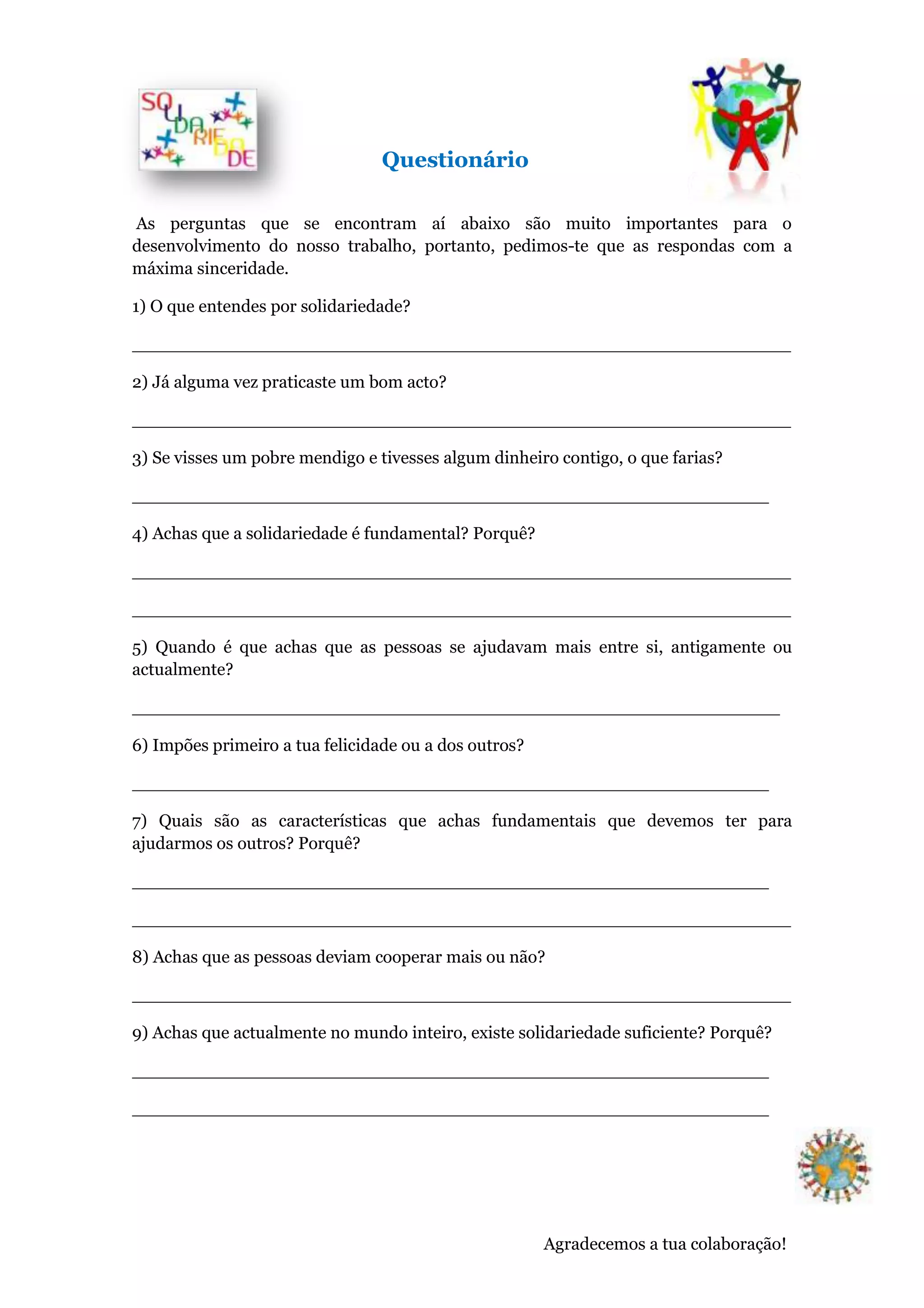 Este documento contém um questionário com 9 perguntas sobre solidariedade e ajudar os outros. As perguntas cobrem tópicos como a definição de solidariedade, experiências de boas ações, como ajudar os necessitados, a importância da solidariedade, se as pessoas eram mais solidárias no passado ou presente, prioridades entre felicidade pessoal e dos outros, características necessárias para ajudar os outros, se as pessoas deveriam cooperar mais, e se existe solidariedade suficiente no mundo hoje.