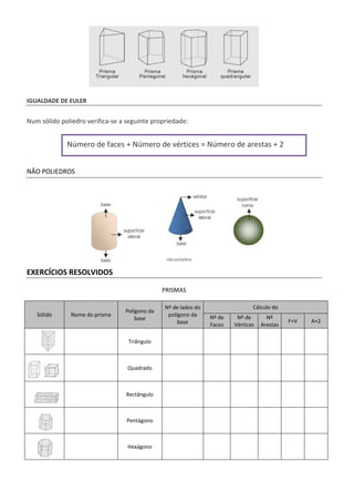 O documento discute os tipos de sólidos geométricos, divididos em poliedros e não poliedros. Poliedros incluem prismas e pirâmides, que são classificados de acordo com o polígono da base. Regras para calcular faces, vértices e arestas de prismas e pirâmides são fornecidas.