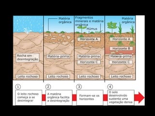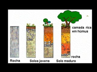 O documento descreve os tipos de rochas, o que é solo, os tipos de solo e técnicas de manejo do solo. Descreve rochas magmáticas, sedimentares e metamórficas. Explica que o solo é composto por sais minerais, seres vivos e rochas em decomposição. Detalha os tipos de solo arenoso, argiloso, humífero e calcário.