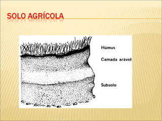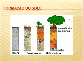 O solo é formado a partir da rocha através da ação do clima ao longo do tempo e da ajuda de organismos vivos, transformando as rochas em material mineral mais macio. O solo é composto por ar, água, matéria orgânica e parte mineral, encontrados misturados. Para ter boas colheitas, um agricultor deve melhorar a fertilidade e estrutura do solo, por exemplo, adicionando matéria orgânica, realizando rotação de culturas e trabalhando a terra.