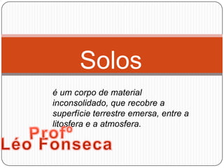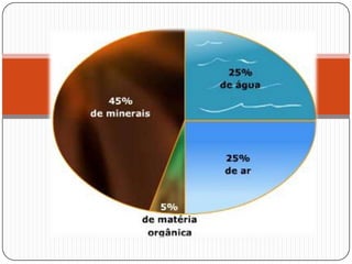 O documento descreve as características e formação dos solos. Os solos são compostos por materiais inorgânicos e orgânicos, formados a partir da decomposição das rochas pela ação de fatores climáticos e organismos vivos. Os solos possuem diferentes horizontes e tipos que variam em composição, cor, fertilidade e permeabilidade.