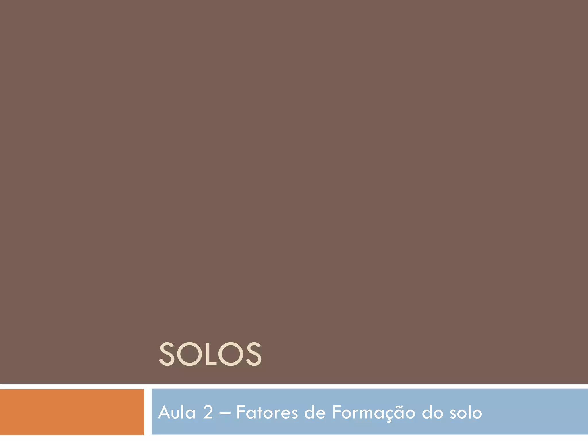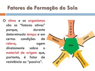 Os principais fatores que influenciam a formação do solo são: clima, organismos, material de origem, relevo e tempo. O clima e os organismos são os fatores ativos, enquanto o material de origem é passivo. O clima, principalmente temperatura e umidade, regulam a decomposição das rochas e crescimento de organismos, formando horizontes distintos no solo. Os organismos, como microrganismos, vegetais e animais, também desempenham papel importante na formação do húmus e estrutura do solo.