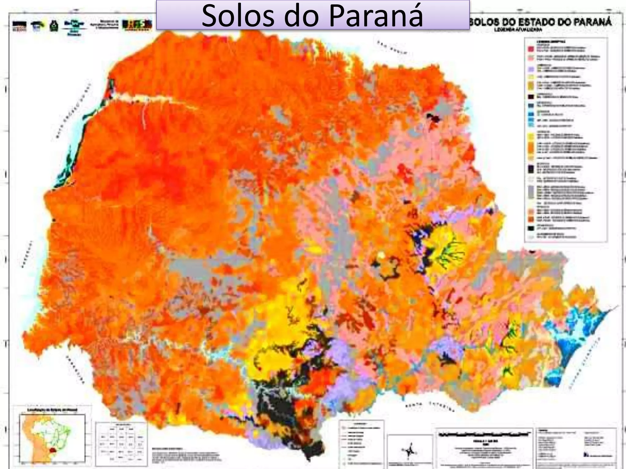 O documento aborda a diversidade de solos no Paraná, com foco no 3o planalto, que possui solos de alta fertilidade devido a derrames de lavas básicas. A decomposição do basalto, principal rocha da região, resulta em solos profundos e férteis, conhecidos como terra roxa. A boa disponibilidade de chuvas contribui para o intemperismo químico e a formação desses solos.