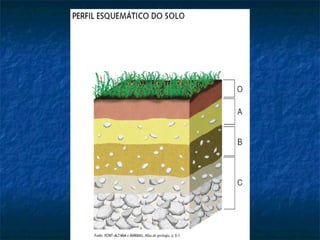 O documento discute os solos, sua formação, tipos e processos de degradação. Resume que os solos são formados pela decomposição da rocha e matéria orgânica, existindo solos azonais e interzonais. Apresenta os principais tipos de solos férteis do Brasil e mundo, e processos como lixiviação, assoreamento e desmatamento que contribuem para o empobrecimento do solo.