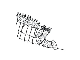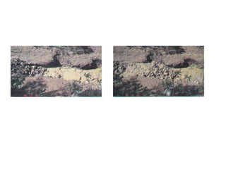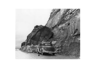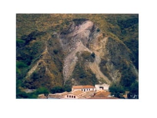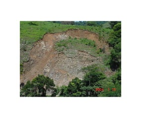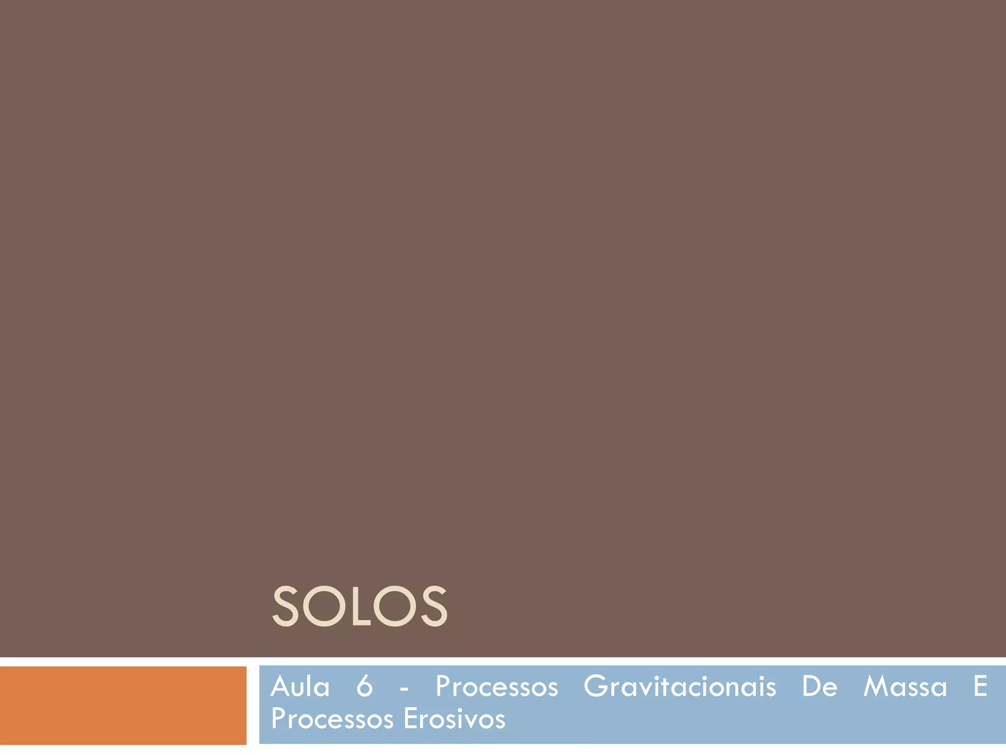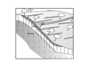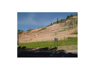 O documento discute processos gravitacionais de massa e processos erosivos em solos. Apresenta os principais tipos de processos endógenos e exógenos, incluindo movimentos de massa como quedas, tombamentos e escorregamentos. Também descreve conceitos de taludes naturais, de corte e de aterro, e classifica os principais tipos de movimentos gravitacionais de massa.