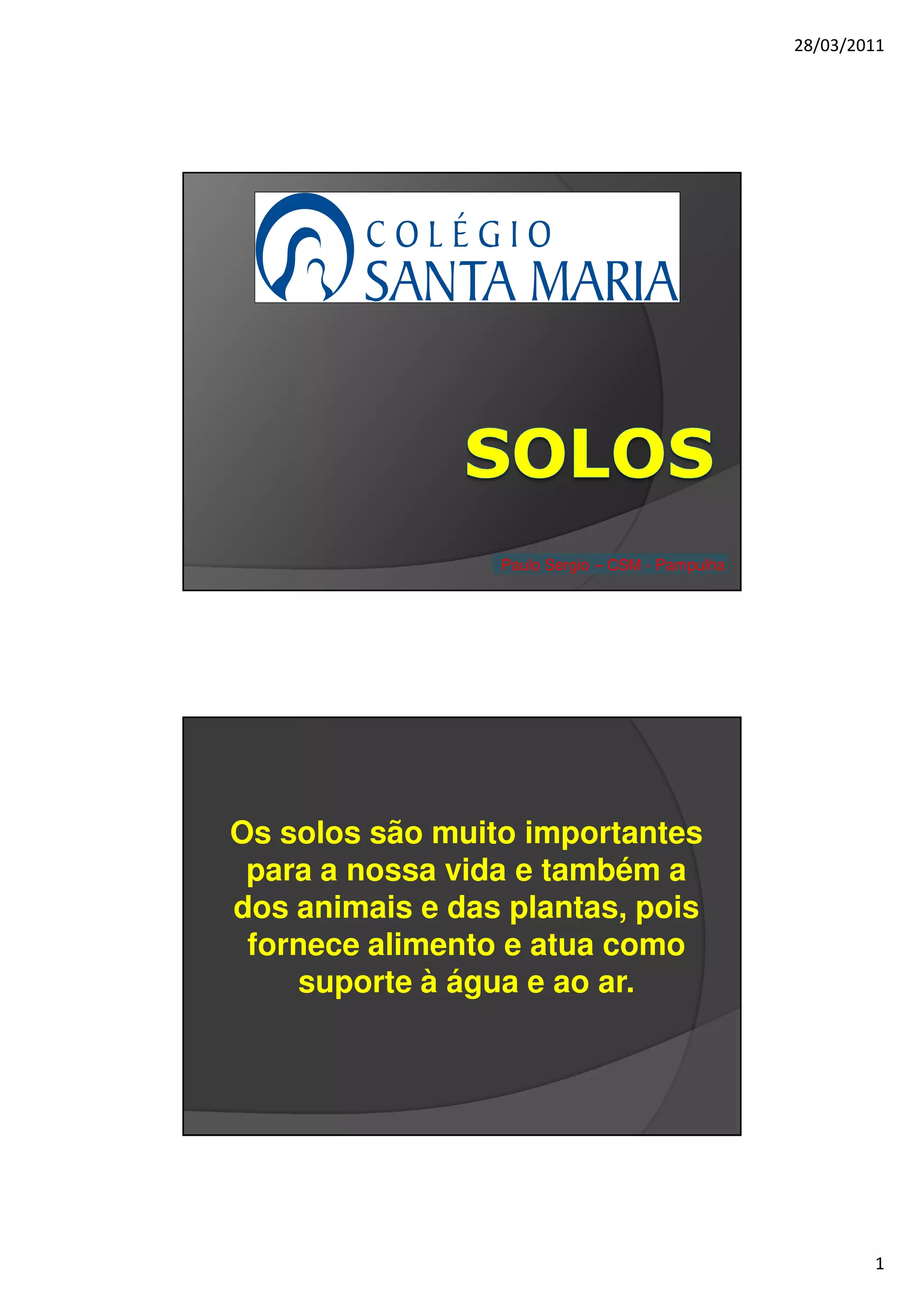 O documento discute a formação e composição dos solos, incluindo como são formados através da ação da chuva, vento e seres vivos sobre as rochas, e como contêm matéria orgânica e minerais. Também descreve cuidados com o solo como adubação e irrigação para mantê-lo fértil, e os perigos da poluição do solo por lixo e produtos químicos.