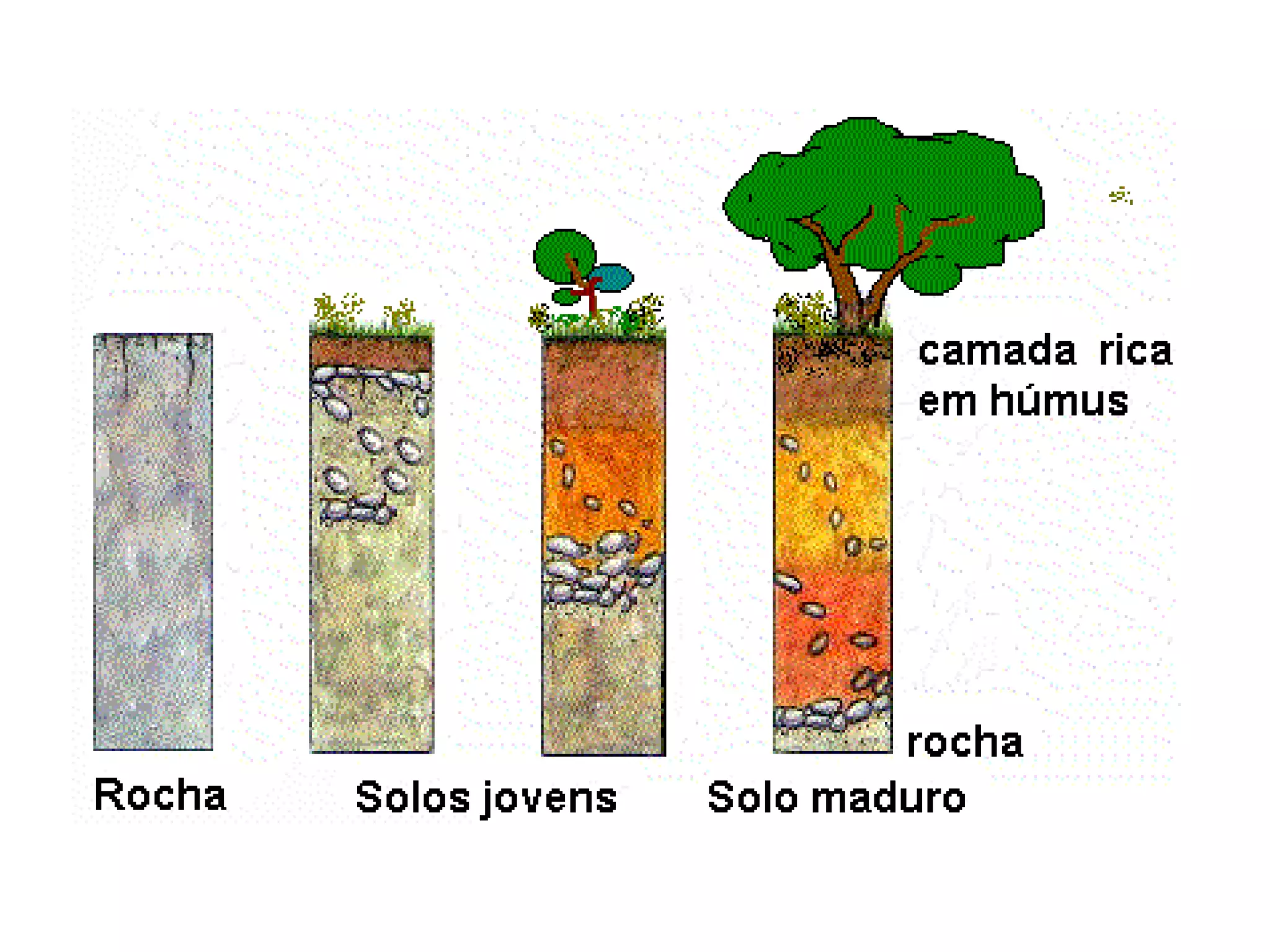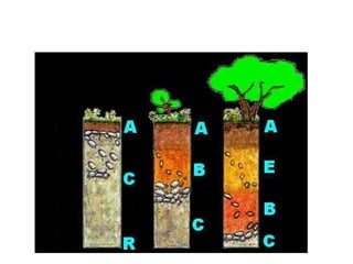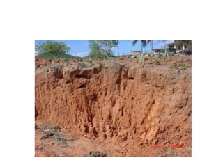 O documento descreve diferentes tipos de solos, incluindo solos arenosos, argilosos, terra preta e terra roxa. Solos arenosos secam rapidamente devido à falta de nutrientes, enquanto solos argilosos podem ficar encharcados. A terra preta é rica em húmus e nutrientes, tornando-a adequada para agricultura. A terra roxa é um solo vulcânico muito fértil encontrado principalmente no sul do Brasil.