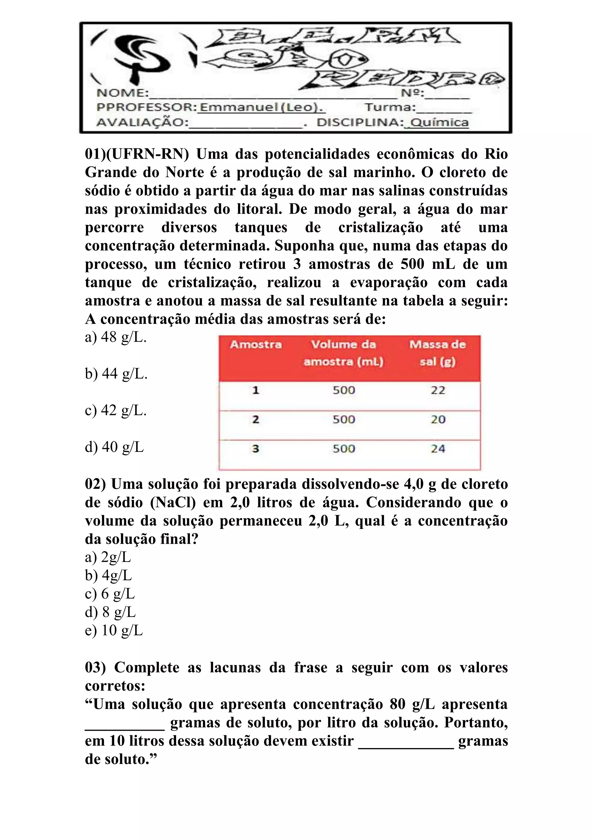1) O documento discute a produção de sal marinho no Rio Grande do Norte através da evaporação da água do mar em tanques de cristalização. Um técnico coletou amostras de três tanques e mediu a massa de sal, encontrando uma concentração média de 42 g/L.
