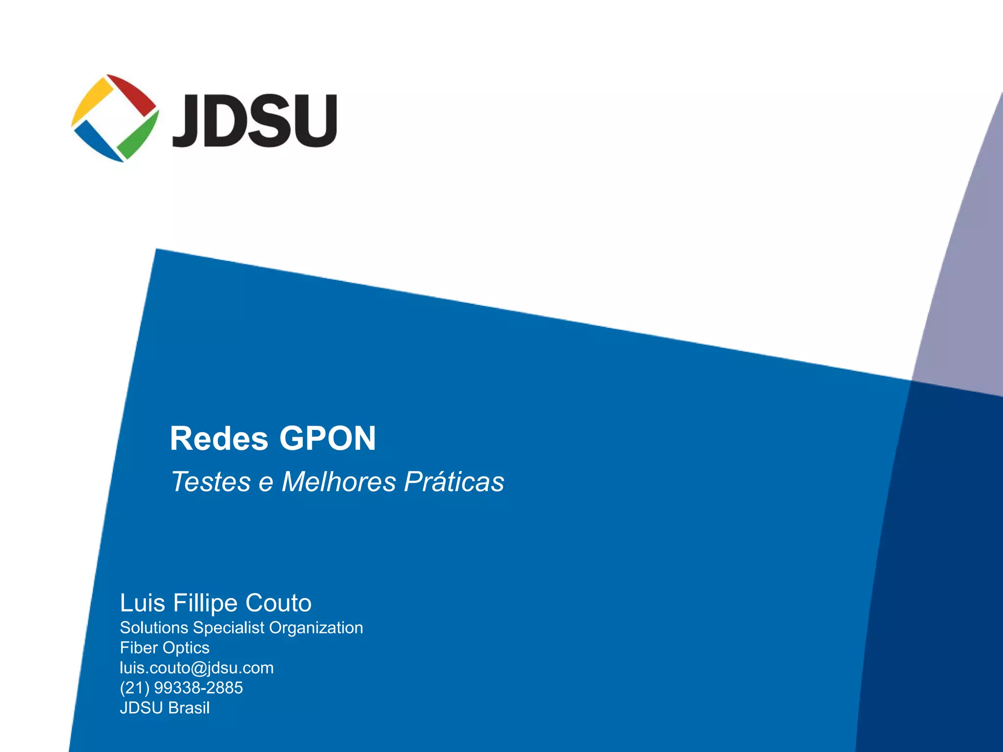 [1] O documento discute testes e melhores práticas para redes GPON, incluindo arquitetura PON, tipos de testes recomendados para construção, instalação, manutenção e monitoração, e equipamentos de teste como OTDR e medidor de potência.