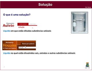 Este documento discute os conceitos fundamentais de soluções químicas. Ele define soluções como misturas homogêneas onde o soluto e o solvente estão misturados em uma única fase. O documento também discute os componentes de uma solução, tipos de soluções, concentrações de soluções e os fatores que afetam a solubilidade, incluindo as forças intermoleculares entre o soluto e o solvente.