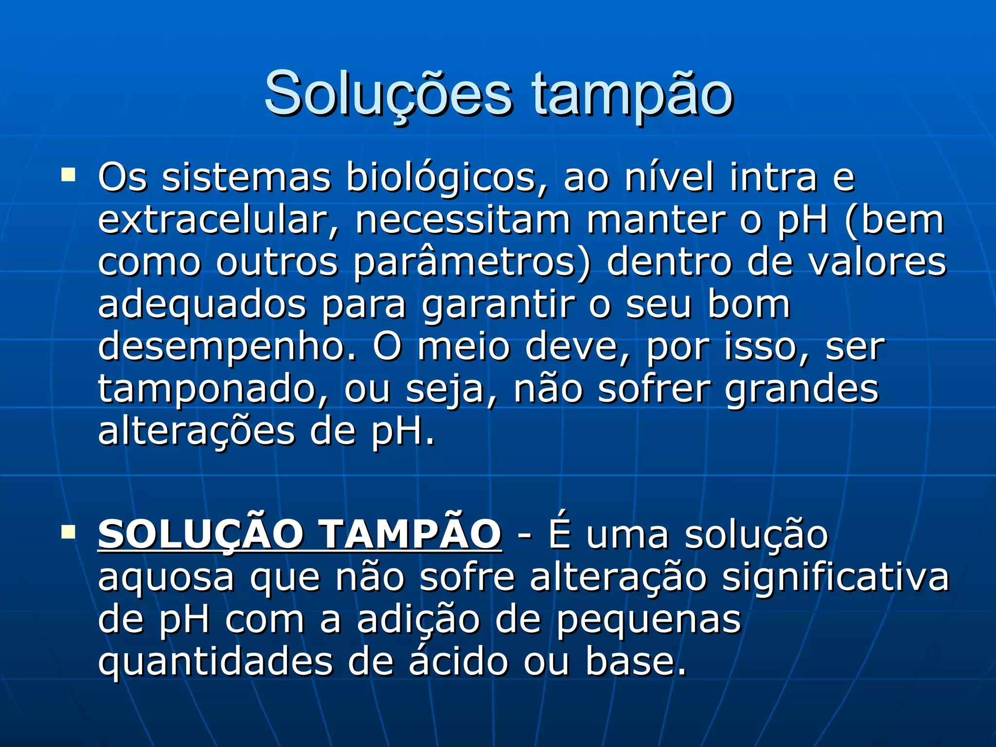 O documento discute soluções tampão e sua importância para sistemas biológicos. Sistemas tampão, como o par ácido-base conjugado, ajudam a manter o pH dentro de valores adequados para garantir o bom funcionamento de células e órgãos. O documento também descreve como preparar soluções tampão usando o exemplo do ácido acético e discute outros sistemas tampão importantes como o fosfato e o bicarbonato.