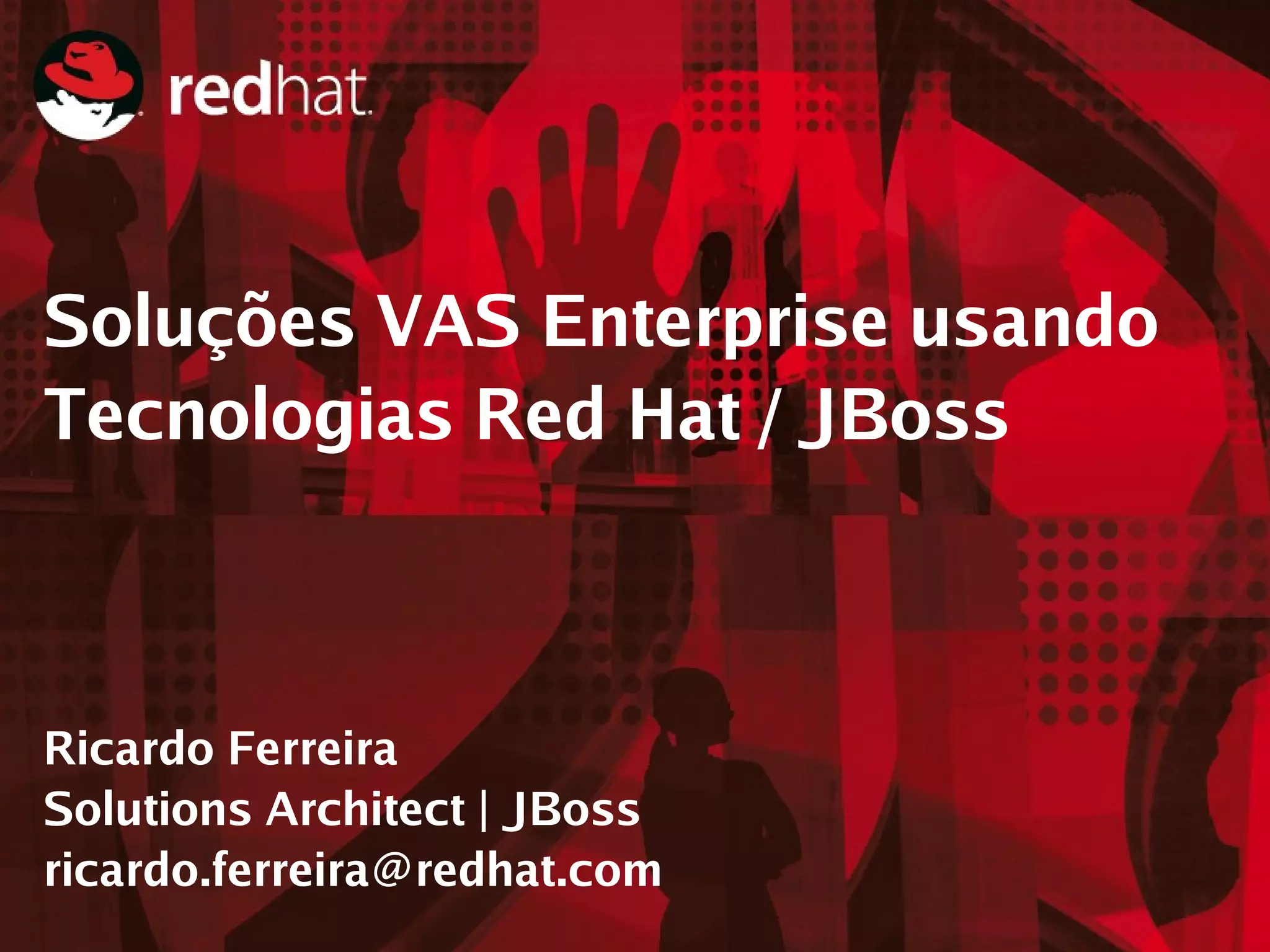 O documento discute soluções de valor agregado (VAS) usando tecnologias Red Hat e JBoss. Apresenta um estudo de caso de um serviço de SMS a cobrar implementado no JBoss que permite o envio de SMS com o pagamento pelo receptor. Também aborda desafios comuns em soluções VAS e como as tecnologias Red Hat podem ajudar a enfrentá-los.