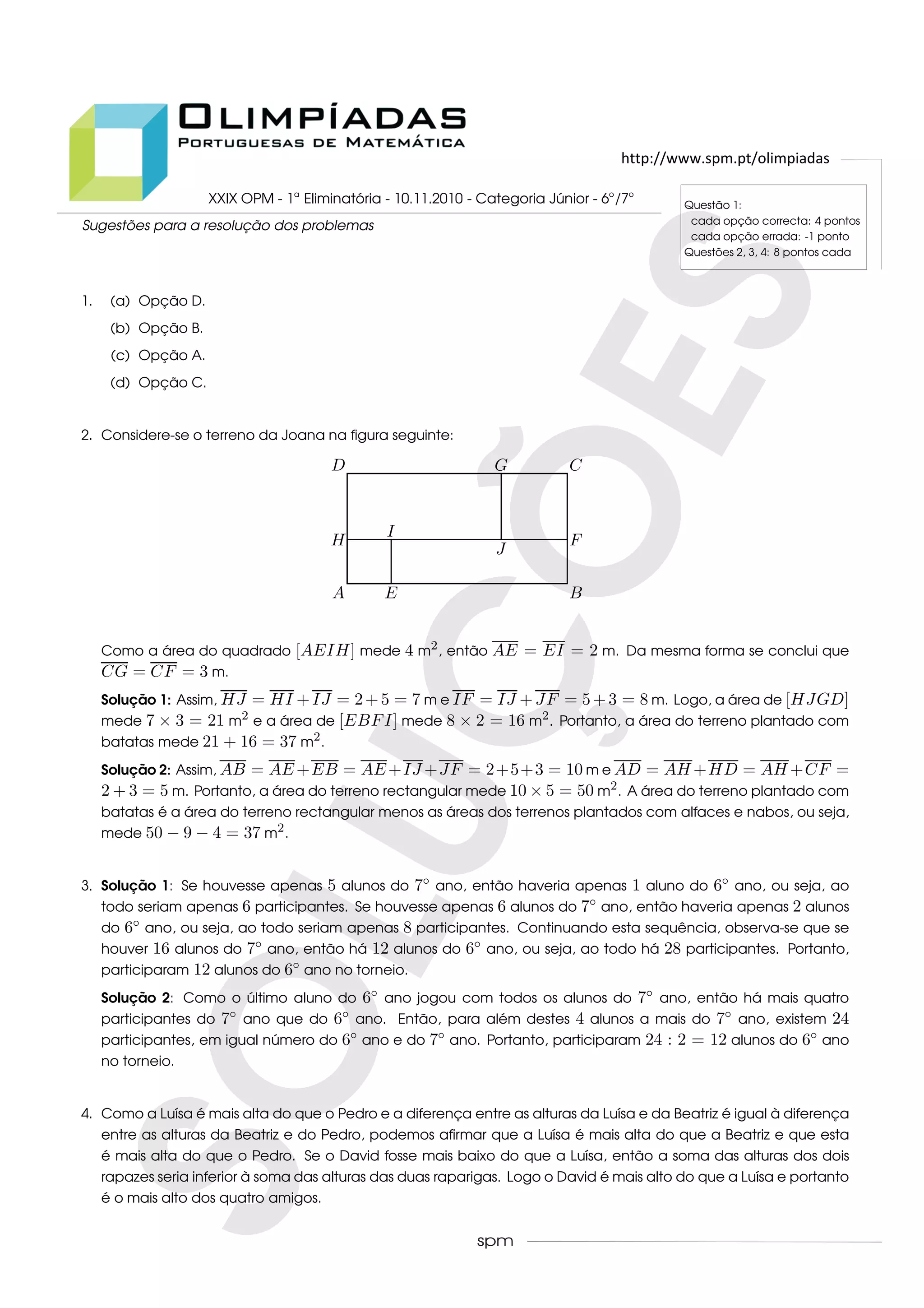 Este documento fornece as soluções para quatro questões de uma prova de matemática para alunos do 6o e 7o ano. A primeira questão lista as respostas corretas para várias opções. A segunda questão calcula a área de terreno plantado com batatas usando duas abordagens diferentes. A terceira questão determina o número de alunos do 6o ano que participaram de um torneio usando duas lógicas. A quarta questão identifica qual dos quatro amigos é o mais alto comparando suas alturas relativas.