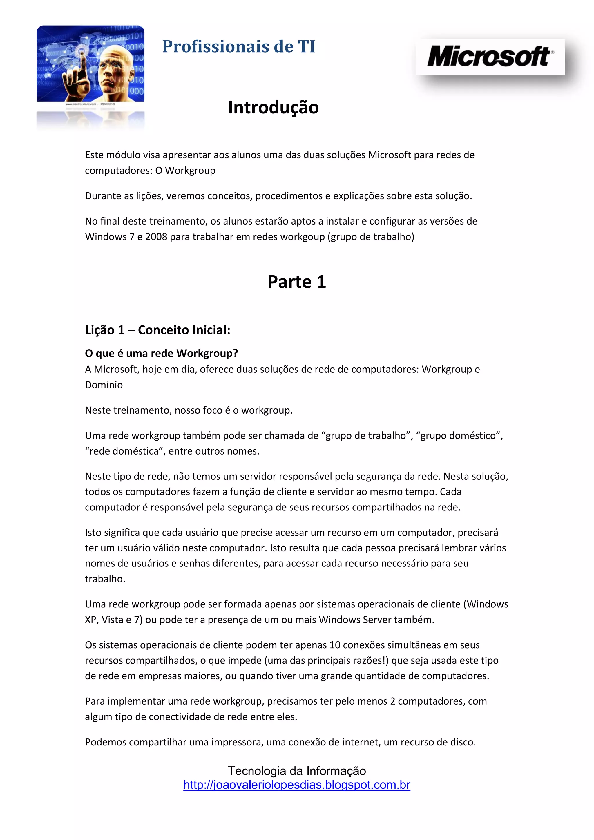 1) O documento apresenta conceitos sobre redes Workgroup e o processo de instalação e configuração do Windows 7 em uma rede Workgroup. 2) É explicado o que é uma rede Workgroup, seus principais componentes e como configurar o TCP/IP, compartilhamentos e usuários. 3) A instalação do Windows 7 é detalhada passo a passo desde a inicialização até a configuração inicial do sistema.