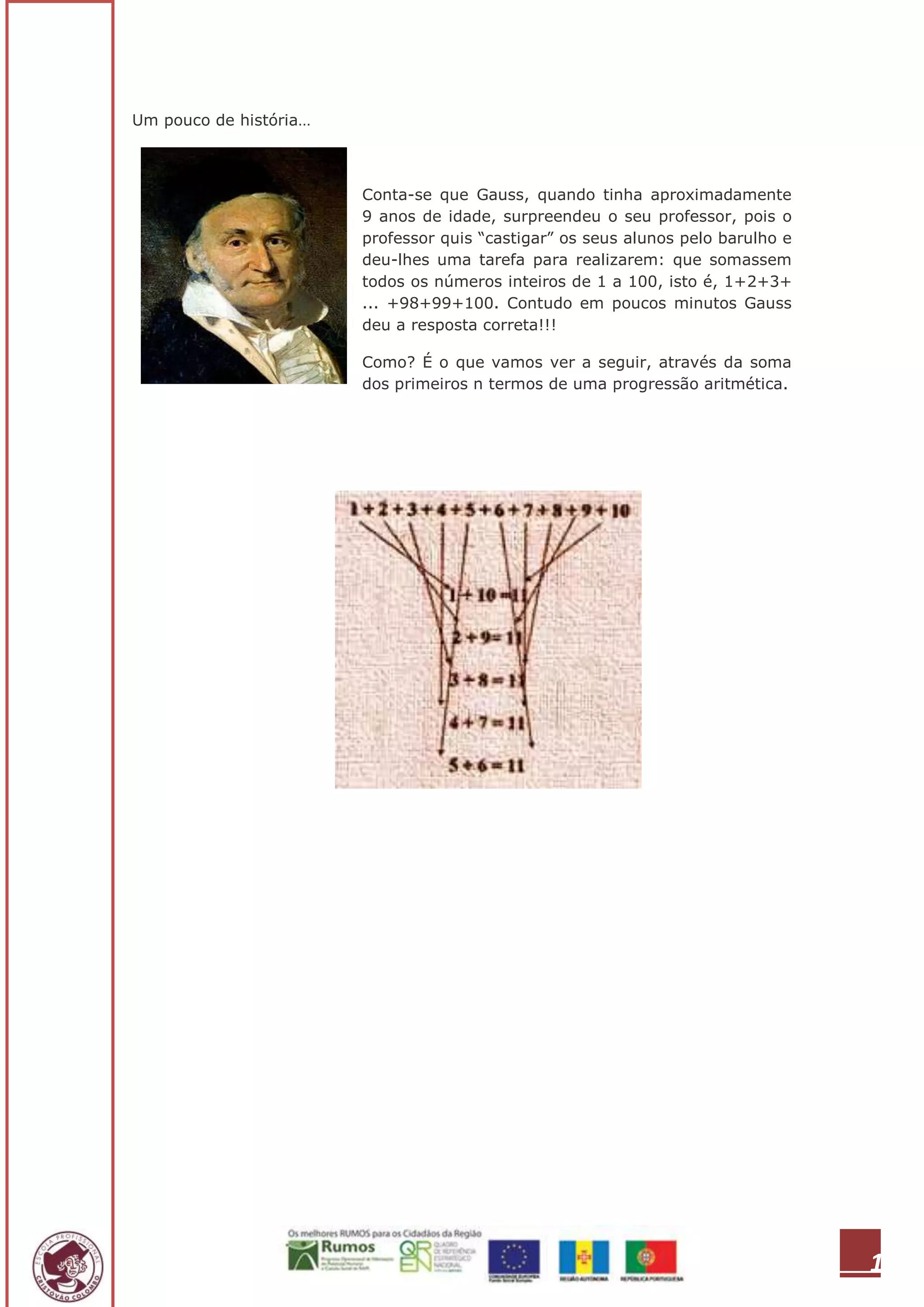 O documento descreve como o matemático Gauss, ainda criança, foi capaz de somar rapidamente todos os números de 1 a 100 usando uma estratégia baseada em progressões aritméticas. Em seguida, apresenta exercícios que ensinam como usar a mesma lógica para resolver outras somas.