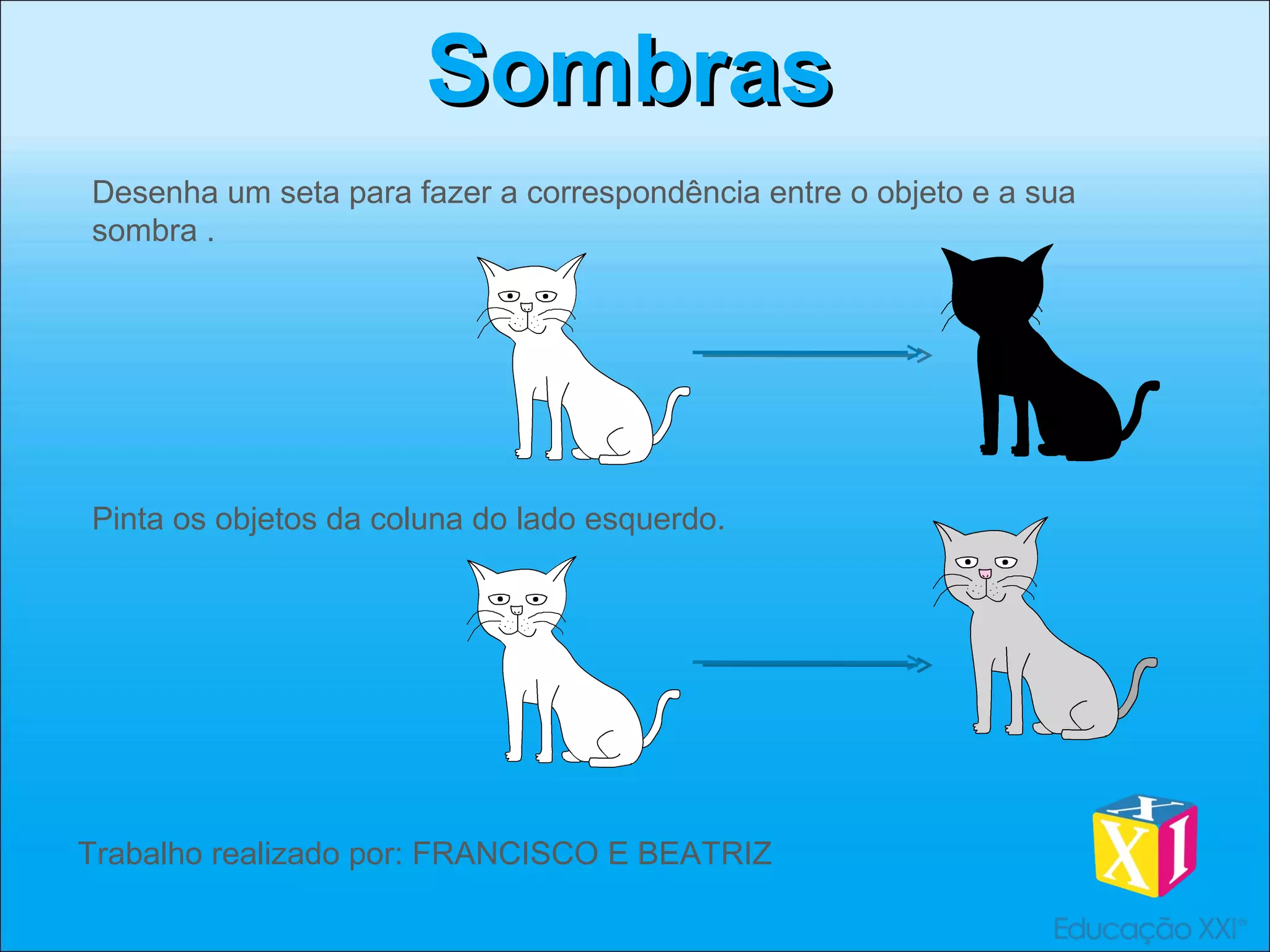 Desenha um seta para fazer a correspondência entre o objeto e a sua sombra. Pinta os objetos da coluna do lado esquerdo. O trabalho foi realizado por Francisco e Beatriz e inclui desenhos de vestuário, animais, transportes e plantas com suas sombras correspondentes.
