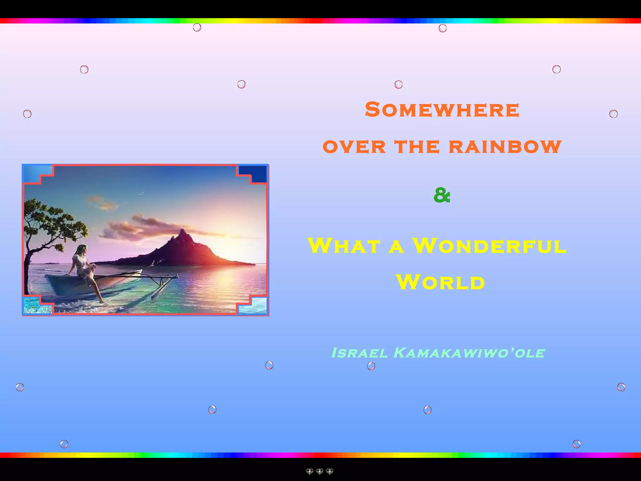 Este documento descreve a música "Somewhere Over the Rainbow" e "What a Wonderful World" interpretadas por Israel Kamakawiwo'ole. A versão de Israel acrescenta versos da música "What a Wonderful World" à clássica canção do Mágico de Oz, cantada de forma melancólica com um ukulele. O documento também fornece informações sobre o filme onde a música foi usada e links para adquirir CDs e receber mais conteúdos.