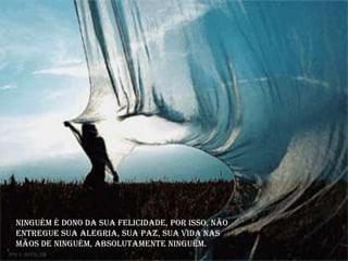 O documento discute a importância de não entregar sua felicidade nas mãos de outras pessoas e de encontrar a paz interior em si mesmo. Também enfatiza viver de acordo com seus próprios desejos e sonhos em vez de colocar objetivos longe demais ou exigir demais dos outros. A mensagem final é para agradecer o que se tem e mostrar seu sorriso aos outros.
