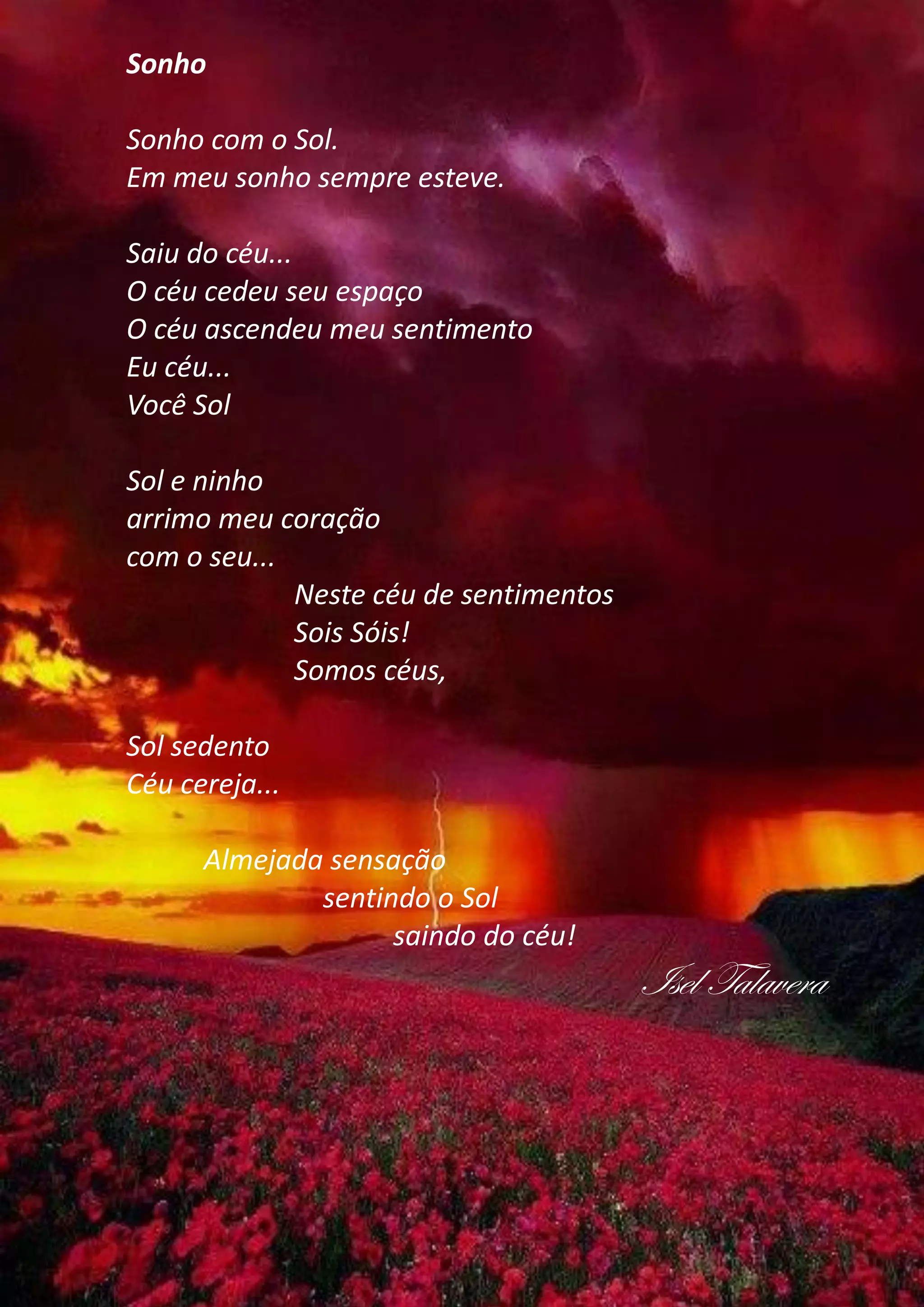 O poema descreve um sonho recorrente sobre o sol. O sono é representado como um céu que abriga sentimentos e acolhe o sol, que aquece e alimenta o coração. A sensação desejada é sentir o sol saindo do céu e aquecendo o sentimento.
