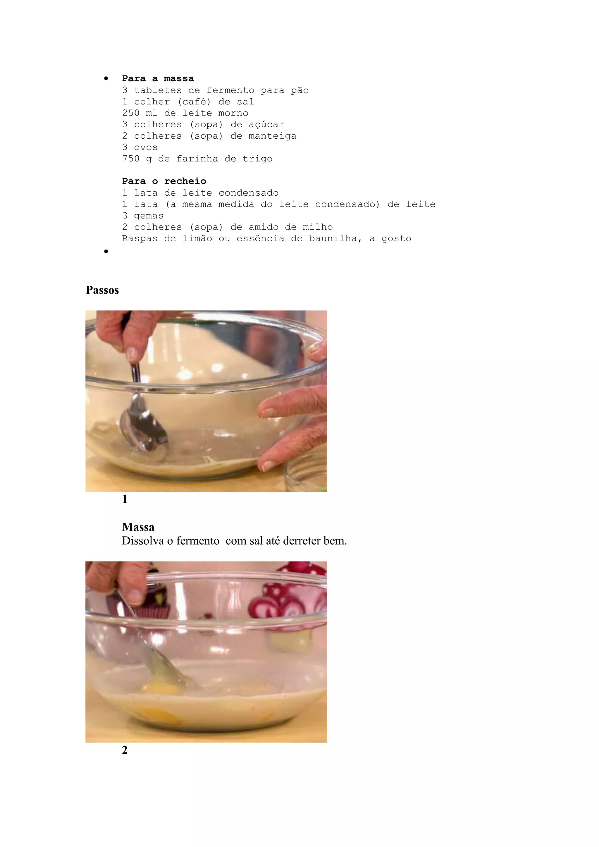 Este documento fornece instruções para fazer sonhos recheados com recheio de leite condensado. A massa é feita com fermento, sal, leite, açúcar, ovos e farinha. O recheio é preparado cozinhando leite condensado, leite, gemas e amido de milho até engrossar. Os sonhos são recheados e polvilhados com açúcar e canela.