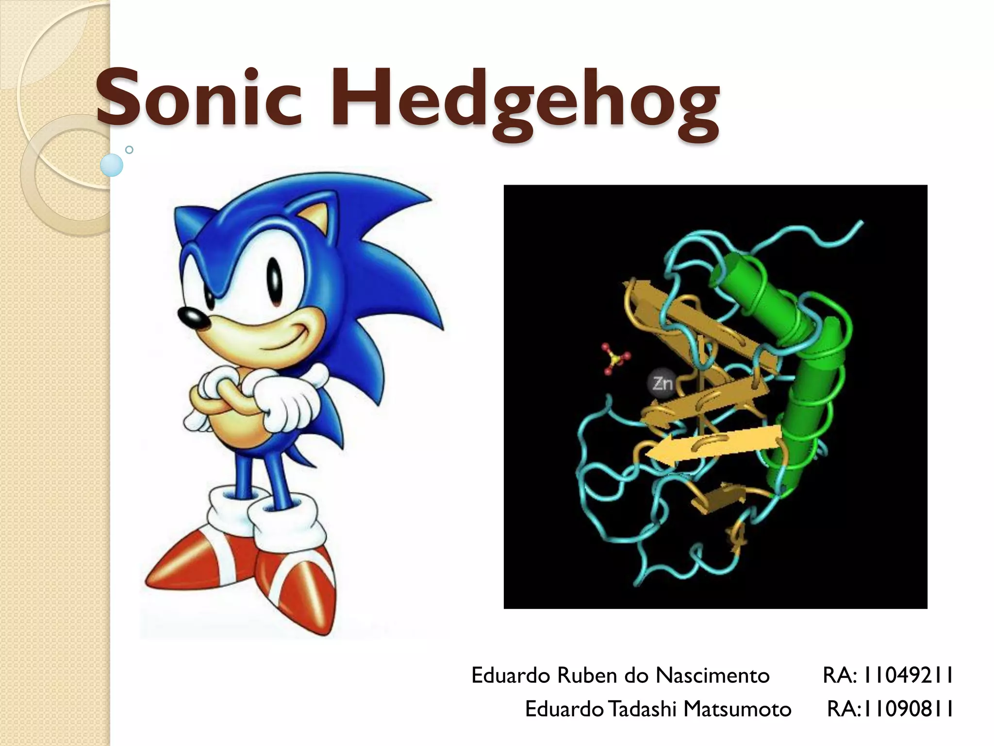 O documento descreve a proteína Sonic Hedgehog, que é essencial para o desenvolvimento embrionário e está ligada ao câncer. A proteína atua como sinalizadora celular e é modificada após a síntese para se ligar à membrana celular e exercer sua função. Seus mecanismos de ação e estrutura são detalhados no documento.
