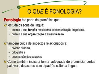 O documento discute os conceitos básicos de fonologia, incluindo fonemas, letras, classificação de sons, sílabas, acentuação, encontros vocálicos e consonantais, ortoépia e prosódia. Fornece exemplos de cada um desses conceitos e explica como eles se relacionam na estrutura da língua portuguesa.