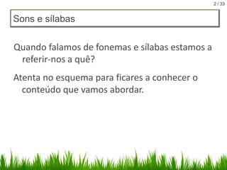 O documento explica conceitos fundamentais da gramática portuguesa relacionados a sons, sílabas e classificação de palavras. Aborda os tipos de sons como vogais, semivogais e ditongos, a diferença entre ditongos e hiatos, a divisão silábica de palavras e classificação por número de sílabas, propriedades acentuais de sílabas tónicas e átonas, e a distinção entre sílabas gramaticais e métricas.