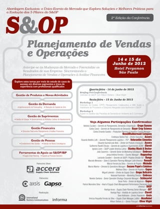 O documento descreve um evento sobre Planejamento de Vendas e Operações (S&OP) que irá explorar soluções e melhores práticas para gestão da demanda, suprimentos, finanças e pessoas. O evento contará com palestras, workshops e casos de sucesso de diversas empresas para discutir a evolução dos pilares do S&OP.