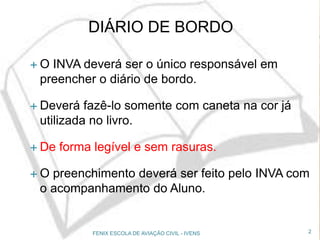O documento estabelece os procedimentos operacionais padrão para a escola de aviação civil Fenix, destacando as responsabilidades do instrutor (inva) no preenchimento do diário de bordo e verificação de documentos necessários para os voos. Além disso, aborda o treinamento prático dos alunos, incluindo requisitos para voos solos e exame final, enfatizando a importância da segurança operacional em todas as atividades. As diretrizes incluem a manutenção rigorosa das aeronaves e a comunicação eficiente entre alunos e instrutores em situações anormais.