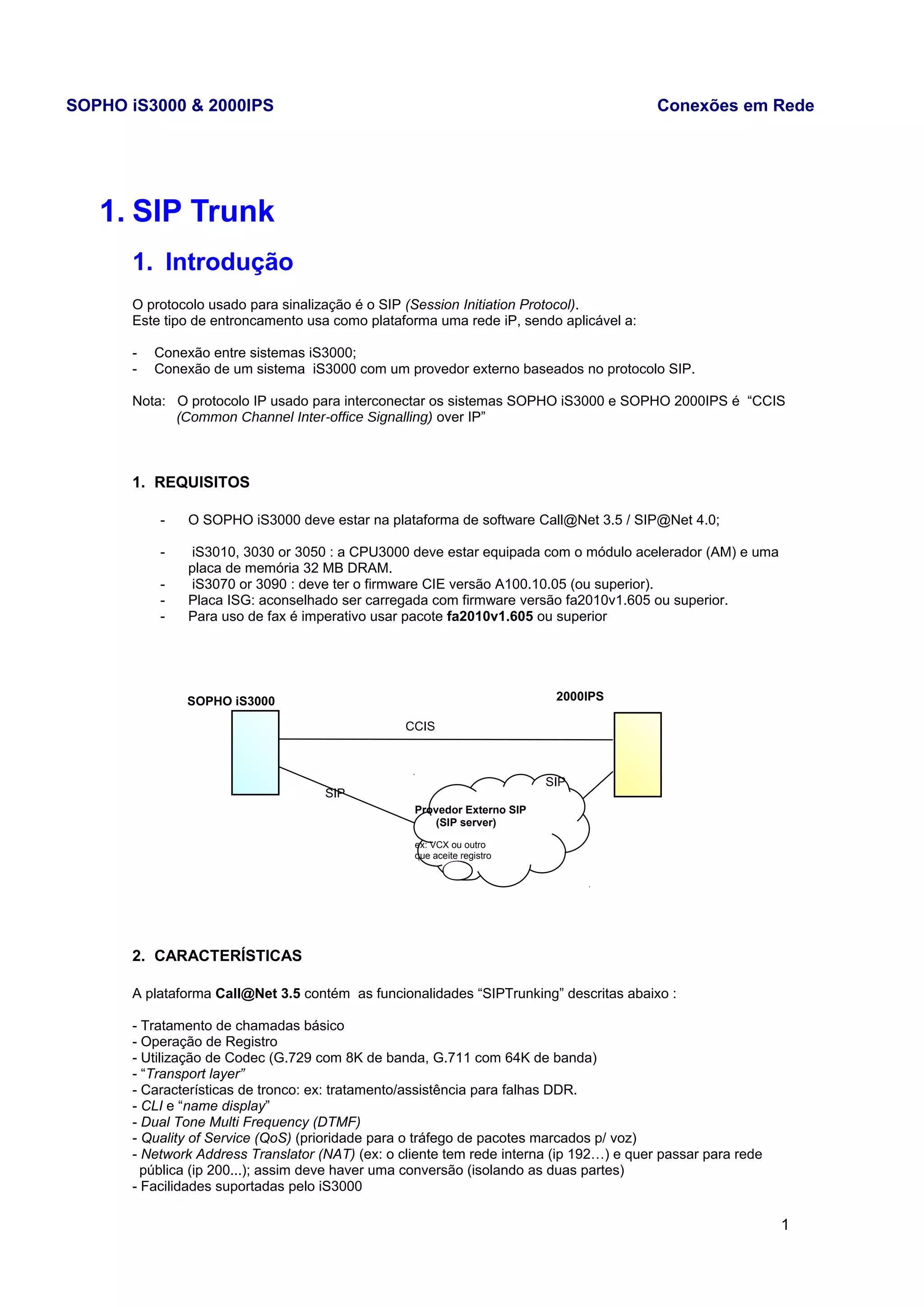 O documento descreve as configurações e características necessárias para conexões SIP entre sistemas SOPHO iS3000 e provedores externos. Inclui detalhes sobre registro SIP, chamadas de entrada e saída, codecs suportados, características de tronco, driver SIP e redundância.