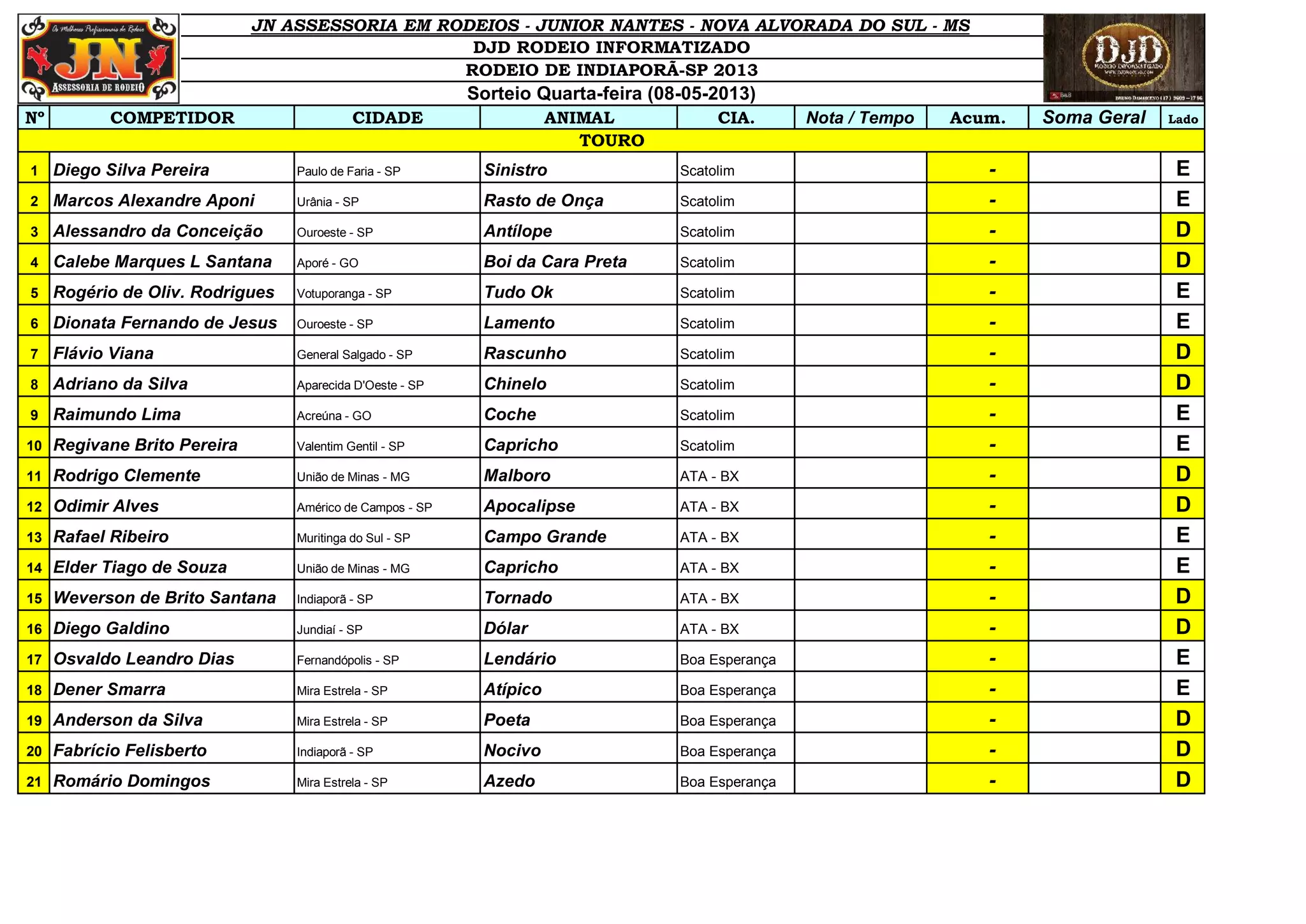 O documento apresenta o sorteio de um rodeio realizado em Indiaporã-SP em 2013, com a lista dos competidores participantes, seus respectivos nomes, cidades e touros sorteados para cada um. Também inclui os nomes dos cinco touros reservas sorteados.